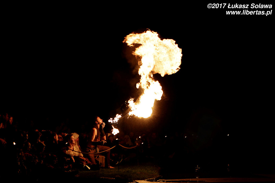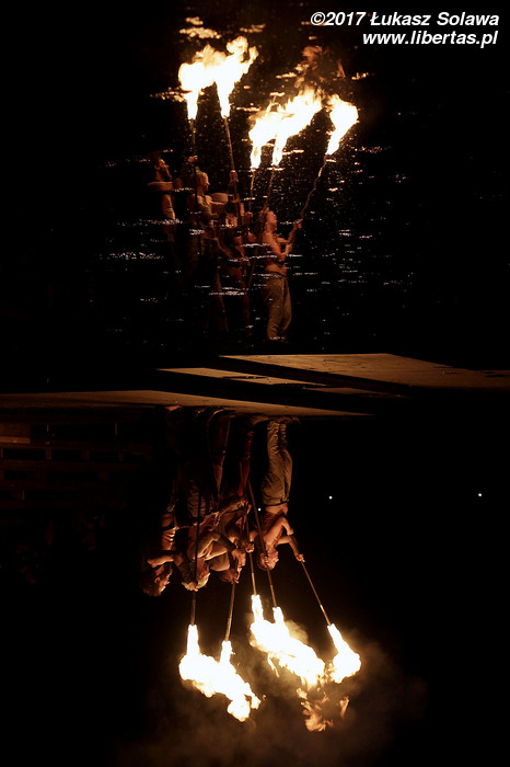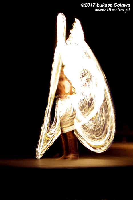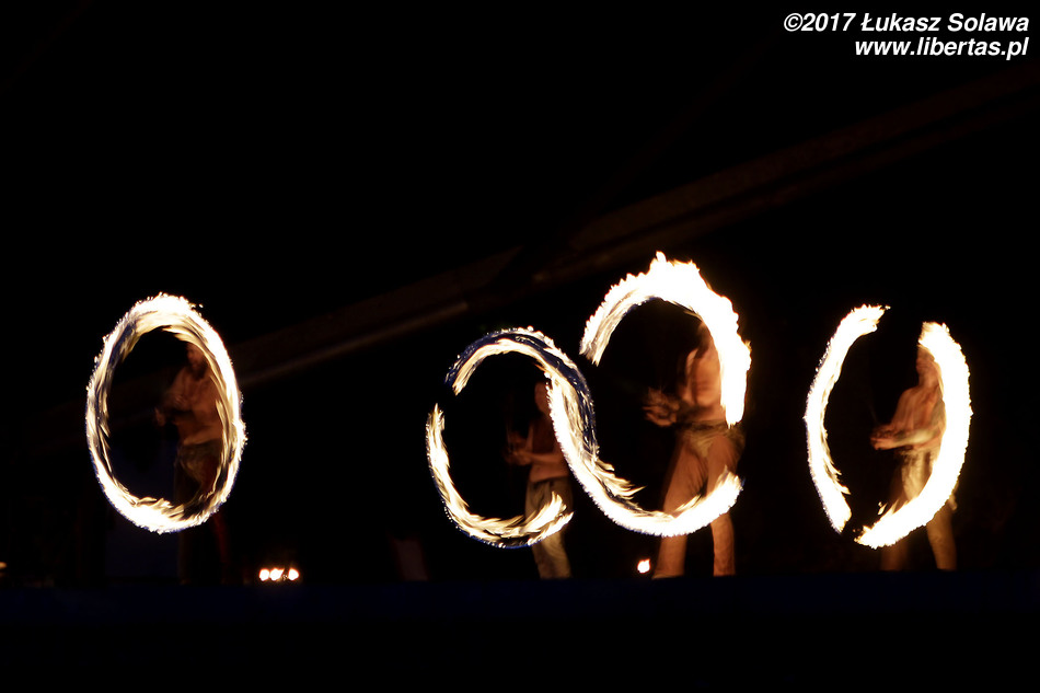 Wróćmy jednak do piątku. Główną atrakcją wieczoru był spektakl ognia. Artyści z grupy Ignis żonglowali, wymachiwali i kręcili wszelkiego rodzaju płonącymi rekwizytami – od poi przez kije i łańcuchy aż po metalowe kule. Do tego „pluli” ogniem i biegali wśród widowni w ognistych konstrukcjach przymocowanych do ramion. Wyglądało to naprawdę spektakularnie i chyba nikt nie narzekał, że pokaz rozpoczął się po godzinie 23.