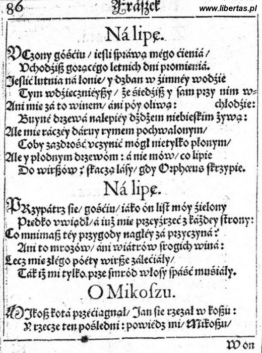 NA LIPĘ (III 7) Przypatrz się, gościu, iako on list móy zielony Prędko uwiądł, a iuż mię przeyźrzeć z każdey strony: Co mnimasz tey przygody nagłej za przyczyna? Ani to mrozów, ani wiatrów srogich wina: Lecz mię złego poety wirsze zaleciały, Tak iż mi tylko prze smród włosy spaść musiały. Jan Kochanowski