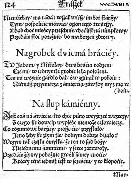 NAGROBEK DWIEMA BRACIEY (III 83) Tu Iadam, y Mikołai, dwa bracia rodzeni Czerni, w iednymże grobie leżą położeni. Ten na woynie gardło dał, ów zginął w pokoiu: Niemasz przymierza z śmiercią, zawżdy my z nią w boiu. Jan Kochanowski