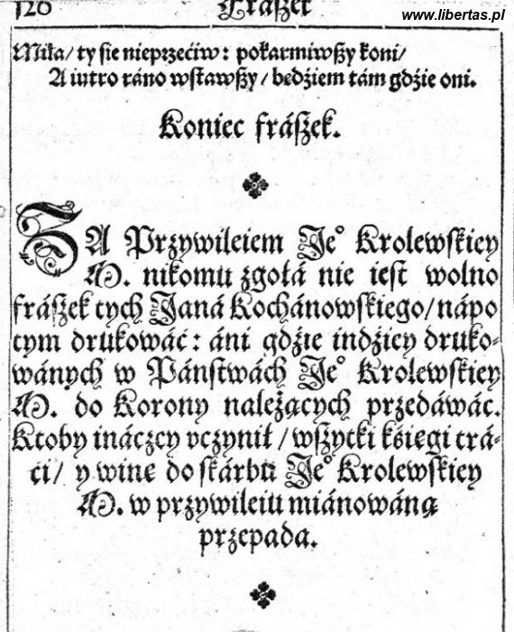 NA SŁUP KAMIENNY (III 84) Iest coś na świecie, kto chce pilno weyźrzeć w rzeczy, Z czego się dowcip wypleść niemoże człowieczy. Co rozumowi barziej, proszę cię, przystało, Jeno żeby się złym źle, dobrym dobrze działo? W czym tak częsta omyłka, że ten to sąd boży, Nieiednemu sumnienie, y serce zatrwoży. Przedsię żiymy pobożnie gwoli samey cnocie, Którey cena iednaż iest w sczęściu, y w kłopocie. Jan Kochanowski