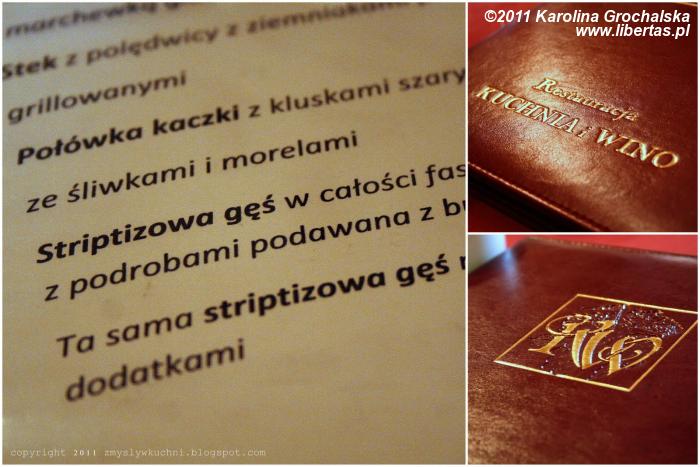 Kilka słów o menu. Według mojego gustu mogłoby być nawet krótsze, nie bardzo rozumiałam, po co znajdują się w nim dania francuskie, obok głównie polskiej kuchni, ale potem dowiedziałam się, że oryginalnie (przed programem TV) to była restauracja serwująca francuskie potrawy. Mimo wszystko uważam, że jak na polskie warunki, w których w większości lokali, w których bywam, ma kartę z setką dań (ciekawe, jak są w stanie utrzymać wszystkie te składniki w świeżości? Oczywiście, że nie są, serwują z mrożonek/gotowców!), to menu w „Kuchnia i Wino” jest stosunkowo krótkie (znajdziecie je na stronie internetowej lokalu). Przyznaję, że zapomniałam przestudiować menu pod kątem win, bo solidarnie nie piłyśmy alkoholu z naszym współbiesiadnikiem, który prowadził samochód.