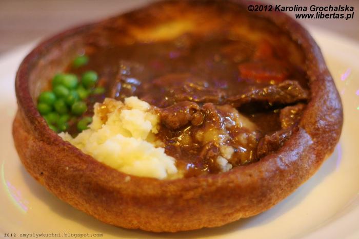 Pub jest uroczy, właściciele sympatyczni, na barze leniwie przeciągał się kot, a pod kominkiem spał pies nie zważając na nic, co dzieje się dokoła. Po wypiciu pinty lokalnego piwa apetyt nam się zaostrzył, a zapach z kuchni zaczął uwodzić. Właścicielka zachwalała zupę (z marchewki i pomarańczy) – orgazm, jak sama twierdziła – ale my mieliśmy chrapkę na mięso. A konkretnie wołowinę długo duszoną w piwie, podaną w gigantycznym Yorkshire puddingu z kremowymi ziemniakami i gotowanym groszkiem. Tradycyjne angielskie jedzenie, proste i tak dobrze ugotowane, że gotowa jestem na to danie wracać i wracać.