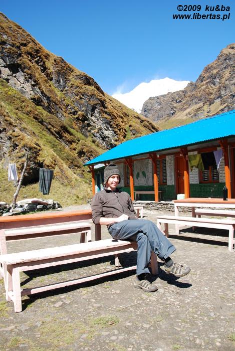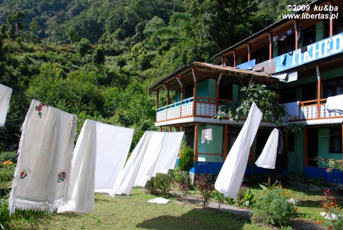 Kwaterunek mamy już za sobą. Nasz dzisiejszy dom nosi nazwę Excelent View Lodge (200 rupii, tzn. 8 PLN za dwie osoby) i jest zdecydowanie najbardziej luksusowym miejscem, z jakim spotkaliśmy się na trekkingu. Duże, dwuosobowe pokoje z balkonem i widokiem na Annapurnę, wygodne łóżka, Internet (podobno czasem działa), pralnia oraz wyposażone w ogrzewacze wody i odpicowane na europejską modłę łazienki. Że też nie trafiliśmy tutaj podczas poprzedniej wizyty w Chhomrong. Zmagania z załamaniem pogody byłyby wtedy dużo przyjemniejsze.