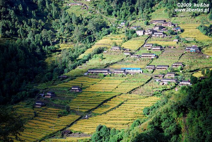 Ruszamy marszowym krokiem i szybko zostawiamy za sobą piękny krajobraz Końskiej Wody. Przez dłuższy czas wędrujemy ubitym traktem prowadzącym wzdłuż spiętrzonych, wartkich dopływów rzeki Bhurundi Khola. Mijamy kolejne wioski – najpierw maleńką i biedną Banthanti, później zamieszkałą niemal wyłącznie przez Magarów2 Ulleri. Z każdą minutą i z każdym krokiem w dół robi się coraz bardziej gorąco i parno, a słońce zaczyna palić całą swoją mocą. Nie łatwo nam znieść ten upał. Przez ostatni tydzień odwykliśmy od temperatur oscylujących w granicach trzydziestu stopni. Moglibyśmy w zasadzie zrobić dłuższą przerwę, by w jakimś zacienionym miejscu przeczekać najbardziej nasłonecznione godziny, ale coś gna nas przed siebie. Chcemy mieć ten męczący nasze i tak już mocno sfatygowane dziesięciodniową tułaczką kolanowe stawy odcinek jak najszybciej za sobą. Tuż przed południem przekraczamy granicę Tikhedhunga. Jest pięknie. Nie może być piękniej. Wszystko każe nam tu zostać. Zostajemy.