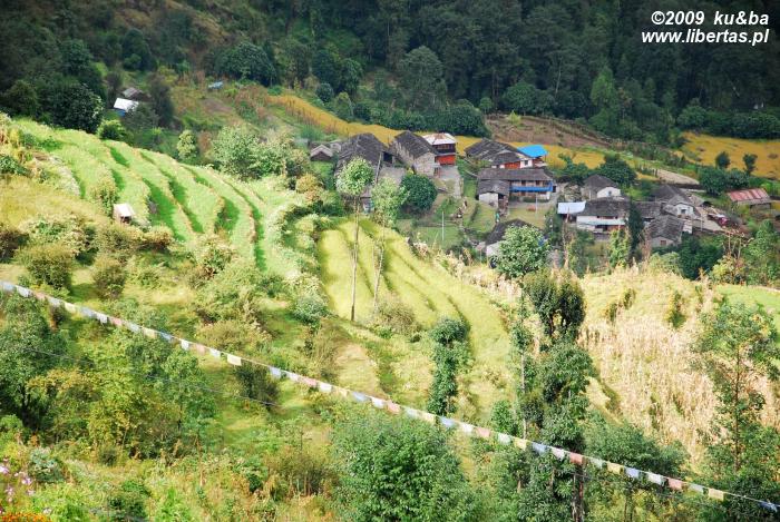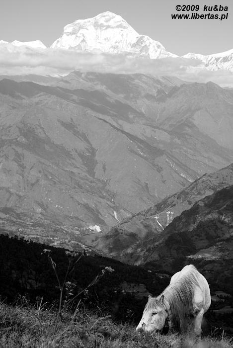 Kiedy wczesnym rankiem wyruszaliśmy na szlak nie sądziliśmy, że zabrniemy aż tak daleko. Chcieliśmy przede wszystkim szybko pokonać pierwsze, bardzo gęsto zalesione odcinki, mając w pamięci doświadczenia sprzed kilku dni, gdy rododendronowe zarośla okazały się naturalnym środowiskiem pijawek. Bogu dzięki, tym razem dzień był suchy i słoneczny. Od takich warunków te rozsmakowane we krwi pierścienice trzymają się raczej z dala. Obyło się więc bez żadnych nieoczekiwanych spotkań i już przed jedenastą, minąwszy wcześniej wioski Taglung i Chhule dotarliśmy do Tadapani. Chociaż przewodniki sugerują, by tu właśnie zatrzymać się na noc, zaraz po skromnym posiłku ruszyliśmy na kolejny odcinek. Pogoda, kondycja i samopoczucie dopisywały – postanowiliśmy skorzystać z tego faktu w stu procentach. Przez następnych kilka godzin dzielnie zmagaliśmy się z kolejnymi podejściami, przekroczyliśmy kilka sporych strumieni, zostawiliśmy za plecami wioski Banthanti i Deurali, by w końcu wylądować tutaj. Zadowoleni z siebie schodzimy z przełęczy i podziwiamy wspaniałą, niezwykle rozległą panoramę masywu Dhaulagiri.