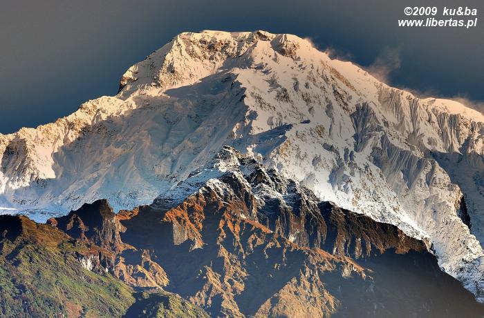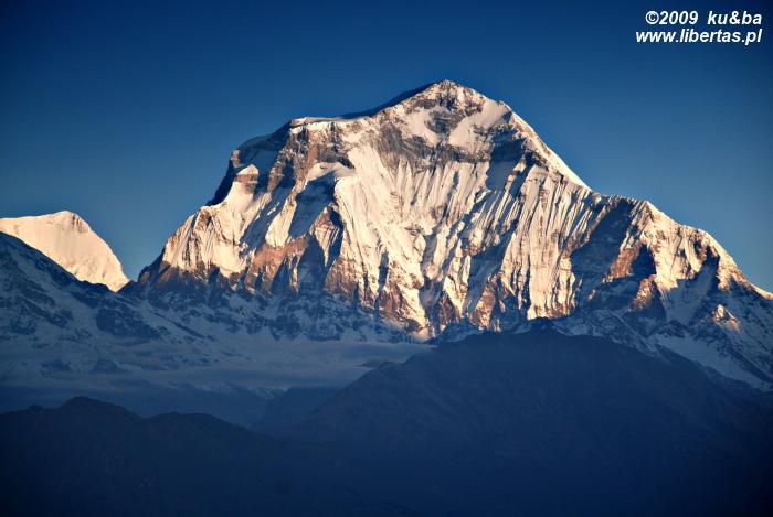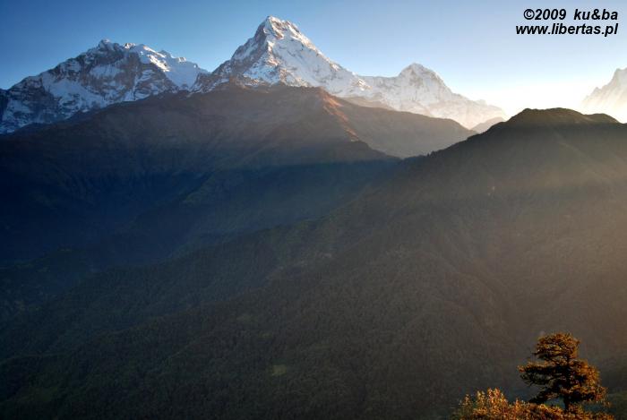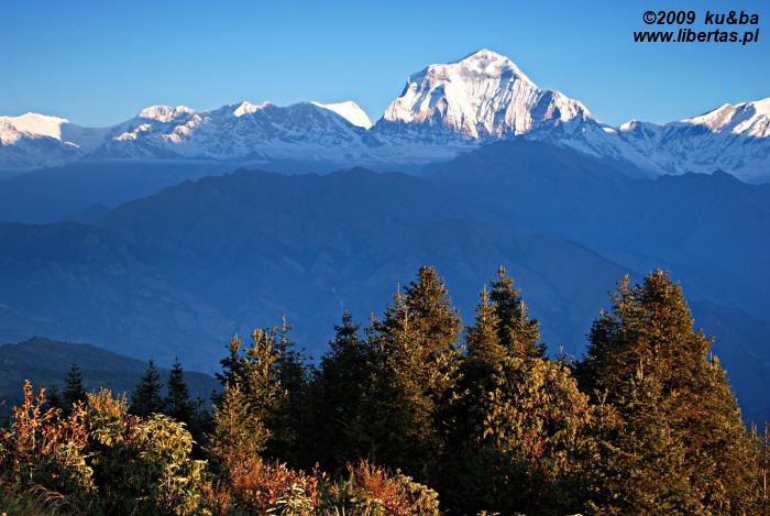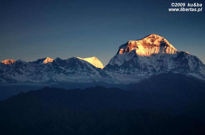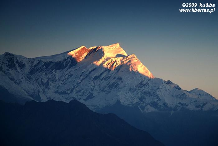 Myśląc o Poon Hill wyobrażaliśmy sobie romantyczny, cichy i spokojny, bo omijany przez wszystkie główne szlaki zakątek, w którym podziwiając wschód słońca oddamy się jakiemuś duchowemu uniesieniu lub głębokiej kontemplacji. Nic z tych rzeczy. Ku naszemu zaskoczeniu i – nie ukrywajmy – rozczarowaniu, okazało się, że na ten rozreklamowany przez wszystkie przewodniki wierzchołek każdego ranka ciągną całe zastępy turystów. Kiedy o 5.30, po czterdziestominutowym spacerze dotarliśmy na szczyt, wieżę obserwacyjną okupowała już całkiem spora grupa ludzi. Teraz – dwa kwadranse później – prawie dwustuosobowy tłum, skutecznie zniechęca nas do Poon Hill. Na górze trzymają nas tylko niepowtarzalne widoki. Rozciągającą się przed nami wspaniałą panoramę tworzy kilkanaście ośnieżonych szczytów, w tym Annapurna I, Annapurna South, Takuche Peak, Nilgiri, Hiunchuli, Glacier Dome, Machhapuchhre, a główną rolę w tym niezwykłym pejzażu odgrywa oczywiście wznoszący się na wysokość 8167 m n.p.m., przyozdobiony porannym światłem wierzchołek Dhaulagiri I.