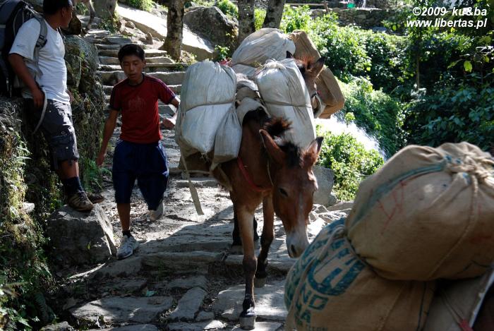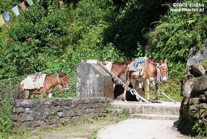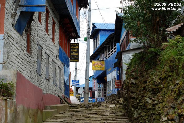 Jak się okazuje, w Ghorepani z noclegiem nie ma najmniejszego problemu (Fishtail Guest House - 100 rupii, tzn. 4 PLN za dwuosobowy pokój i nieograniczony dostęp do ciepłej wody!). Baza turystyczna jest tu chyba jeszcze lepiej rozwinięta niż w Chhomrong. Zdaje się, że to w ogóle jakaś bardziej cywilizowana wioska. Sporo hoteli, kilka knajpek i piekarni, sklepy z jedzeniem, asortymentem turystycznym i książkami, stragany z pamiątkami oraz kilkadziesiąt okazałych domostw – większość z nich umiejscowiona przy centralnym placu lub wzdłuż kamiennego traktu, który ciągnie się przez całą wioskę, a po opuszczeniu jej granic wiedzie na południowy-wschód do Pokhary lub na północ do Tatopani, Jomosom i Muktinath. Ghorepani od dawna jest ważnym przystankiem między tymi ośrodkami. Nic dziwnego. Obfita w wodę okolica czyni tą urokliwą wioskę idealnym miejscem odpoczynku dla poganiaczy i wykorzystywanych przy transporcie zwierząt. Domyślamy się, że stąd właśnie wzięła się nazwa Ghorepani, którą z języka nepali przetłumaczyć można jako „Końska Woda”.