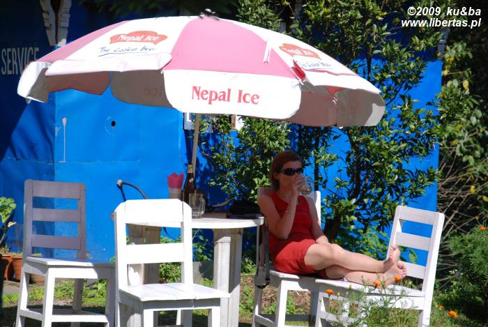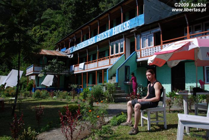 Tikhedhunga Guest House, w którym zatrzymujemy się na noc, jawi nam się jako raj na ziemi. Wylegujemy się w dużym, zielonym ogrodzie zawieszonym nad wzburzoną na tym odcinku rzeką Tikhedhunga, susząca się na sznurze pościel pachnie świeżością i wygodą, na kamieniach grzeją się jaszczurki a z gałęzi drzew płynie w naszą stronę ptasi koncert. Takiej właśnie błogości potrzebowaliśmy. Najbardziej potrzebowały jej nasze ciała, które od dłuższego czasu poddawaliśmy ascezie i najrozmaitszym doświadczeniom – testom wytrzymałości na wytężony wysiłek i związany z nim ból mięśni, kolan oraz karku, próbom odporności na zimno i upał, deszcz i palące słońce, wysokość i całą masę drobnych dyskomfortów. Teraz budzą się w nich pragnienia, a my nie jesteśmy na nie obojętni. Dokładnie kąpiemy ciała, karmimy obficie, poimy wodą i piwem. Morzem piwa. Rozochocone żądają więcej. Tu i teraz. Chcą rozkoszy w czystej postaci. Bliskości drugiego ciała, czułości wiatru, pieszczot wilgotnej trawy, delikatnego dotyku słońca. Dajemy im wszystko w nadmiarze. Oczy aż płoną od splendoru wrażeń. Z całej okolicy spływają na nas gęste dreszcze. O tak, szczęście ma w Tikhedhunga wyjątkowo cielesny smak.