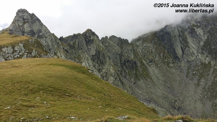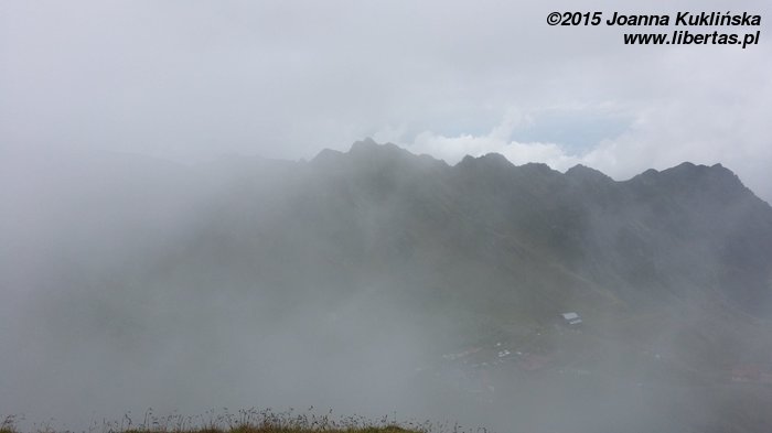 Po wejściu na przełęcz kontynuujemy marsz według innego oznaczenia. Rozpoczynamy następną mozolną wspinaczkę szlakiem czerwonego paska – jesteśmy teraz na grani głównej Fogaraszy – jeszcze 100 metrów w górę i zdobywamy szczyt Varful Iezrului (2417 m n.p.m.). Jak przetłumaczyć jego nazwę? Może: „Jeziorak”? Gdyby nie mgła, pewnie roztaczałby się stąd niesamowity widok na co najmniej 5 jezior (największe – Balea Lac – na północy, Lacul Capra i Lacul Caprita na wschodzie i dwa mniejsze jeziorka w Długim Kotle (Caldarusa Lunga) – na zachodzie). Tak przynajmniej wynika z mapy. My widzieliśmy czubki naszych zmokniętych nosów. Ale wkrótce, to wszystko miało się zmienić, o czym jeszcze nie mieliśmy pojęcia i każdy chyba w duchu żałował, że dał się namówić na tę mozolną wędrówkę bez szans na widok na choćby mały kawałek skałki.
