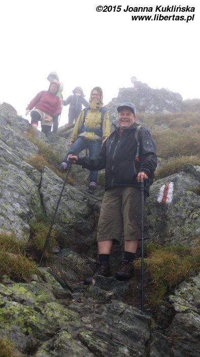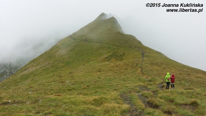 Schodzimy na przełęcz i skąd wiem, że grań jest eksponowana? Bo mgła się zaczyna przerzedzać!