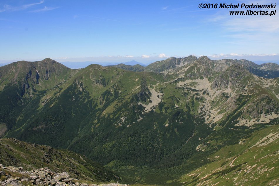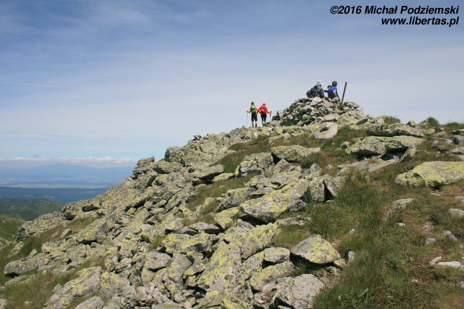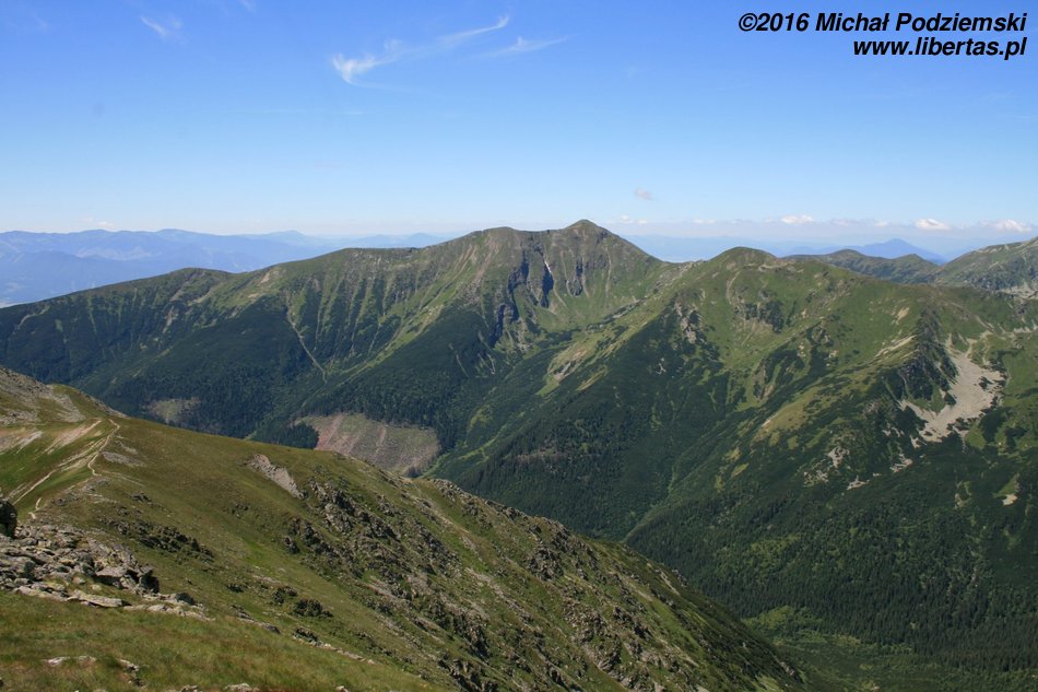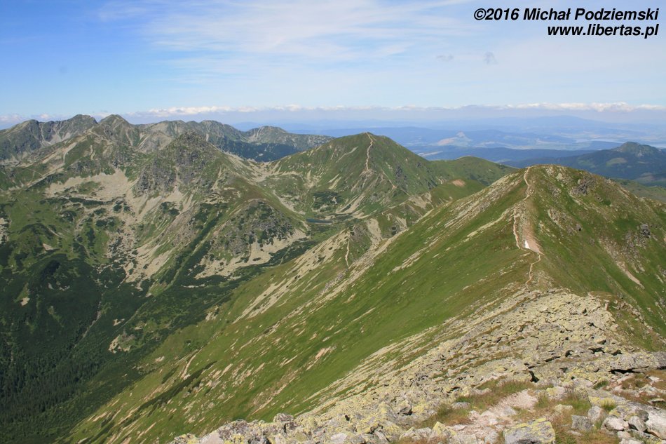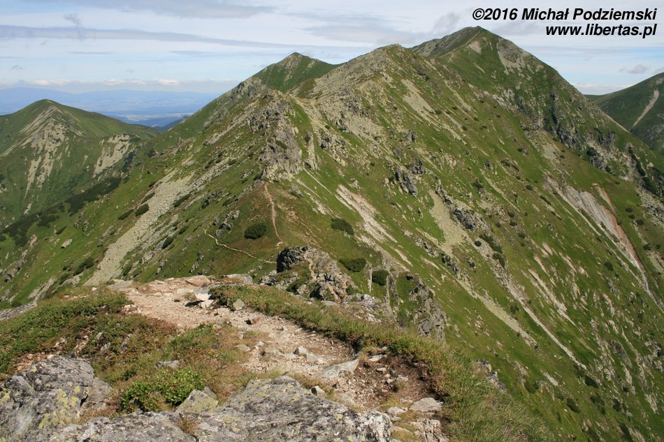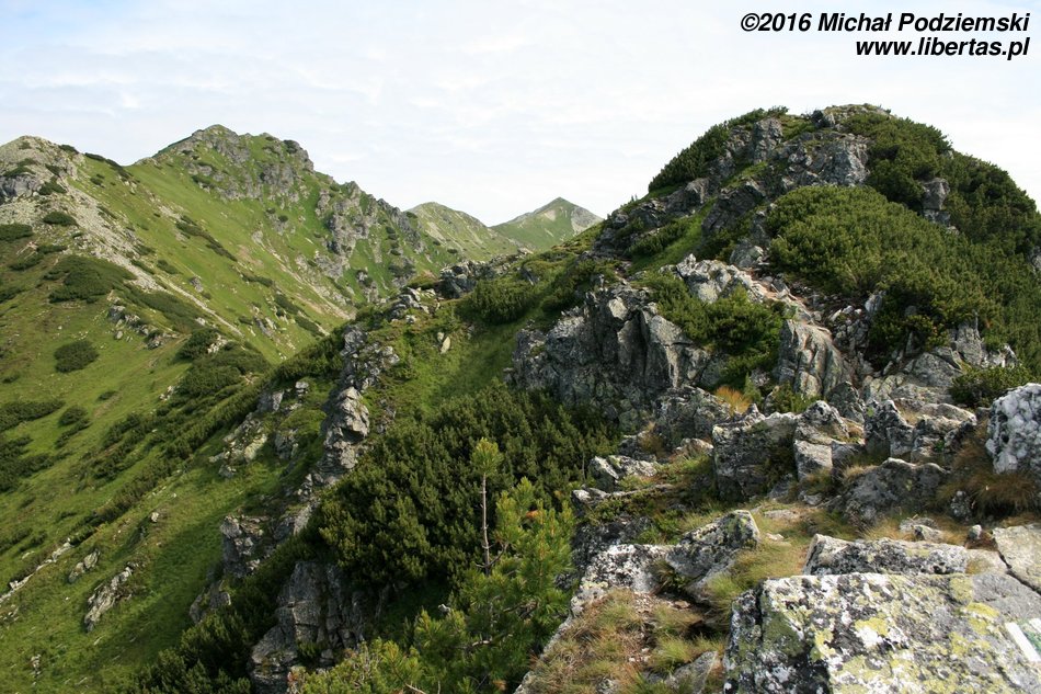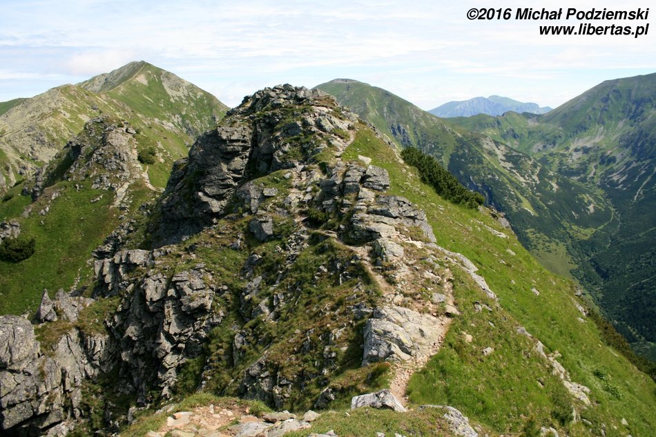 Przed nami wyłaniać się będą kolejne szczyty, tworzące grań Otargańców, a więc czeka nas teraz seria zejść i podejść – męczących, jednak czym jest zmęczenie w takich okolicznościach! Nad Doliną Jamnicką kapitalnie widoczne są Barańce i dalej cała grań aż do Rohaczy, nas natomiast szlak prowadzi zielonym grzbietem, z którego co jakiś czas wyrastają postrzępione granitowe masywy – w tych miejscach zachować musimy szczególną ostrożność, ponieważ teren jest tu dość eksponowany. Dalej grań prowadzi znowu komfortową ścieżką, ale długim podejściem na Wyżnią Magurę (tam widoki są już naprawdę imponujące), a za nią znajduje się wreszcie Jakubina.