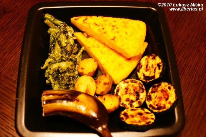 Zacznę od polenty, wynalazku ze stajni mojej kochanej Coccina Italiana. Wynalazek stary jak Cesarstwo Rzymskie, doskonały na praktycznie każdą okazję, o czym sami się przekonacie. Do wykonania potrzebujemy kaszę kukurydzianą, lekko osoloną wodę, łyżkę masła i garnek bądź głęboką patelnię. Wlewamy około 3 cm wody i wsypujemy kaszę, tak żeby woda nieco ją przykrywała. Całość gotuje się na małym ogniu, około 40 min., kasza szybko pije wodę i pęcznieje, w związku z tym raz na jakiś czas trzeba jej dolewać odrobinę wody. Całość musi mieć bardzo zbitą, gęstą konsystencję, przyjmuje formę placka, który bez problemu odchodzi od dna garnka. Ostygniętą polentę można kroić w kostkę i stosować do szaszłyków, można ją też grillować np. podlaną oliwą z czosnkiem i posypaną startym parmezanem czy w formie sałatki ze świeżym szpinakiem, pomidorami, oliwkami i orzechami włoskimi.