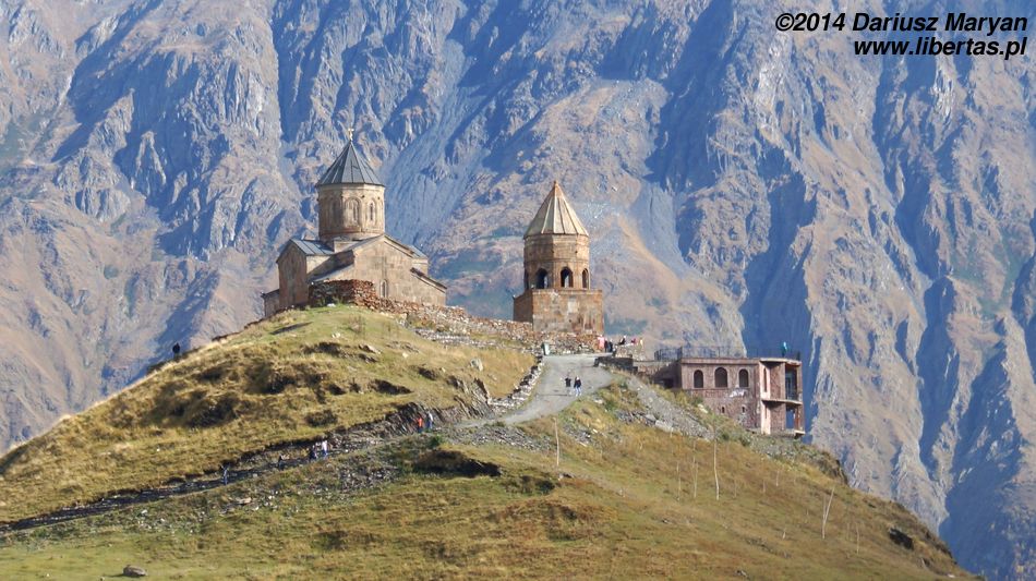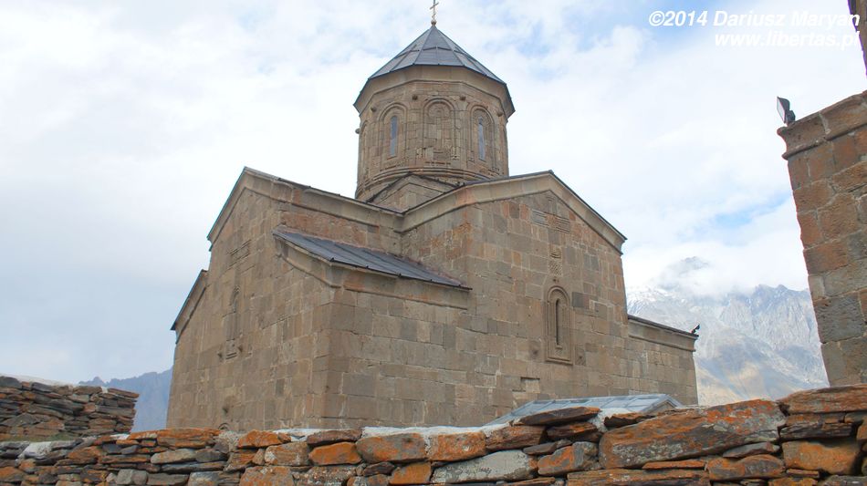 Ruszyliśmy więc na skróty, przechodząc po drodze przez wioskę Gergeti. Podejście z Kazbegi na szczyt zajęło nam około czterdziestu minut nieśpiesznego marszu. Klasztor został zbudowany w XIV wieku. Znajduje się na wysokości 2170 m n.p.m. Poza pięknym, malowniczym położeniem kościół niczym szczególnym się nie wyróżnia. Nieopodal znajduje się źródełko, z którego można skorzystać. W Cminda Sameba zostaliśmy przez dłuższą chwilę dla pięknych widoków.