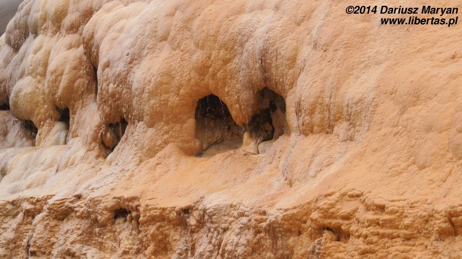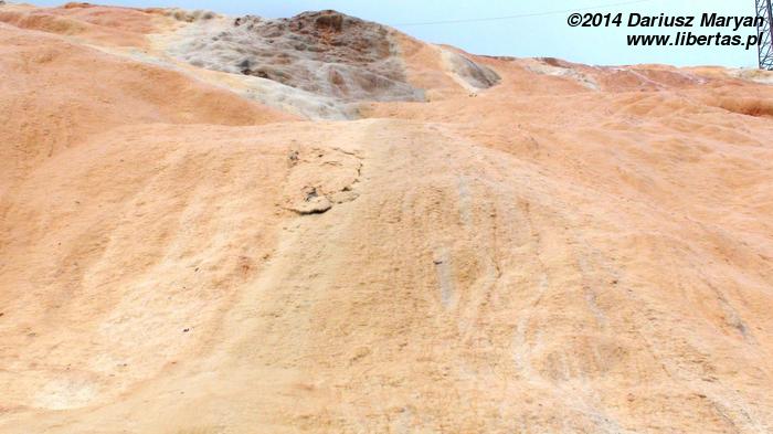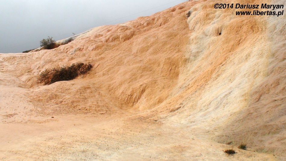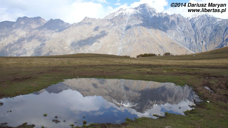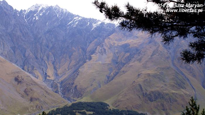 Stąd trasa wiodła do doliny Tereku. Po kilku minutach jady w końcu wyjechaliśmy z chmur i powróciły widoki na okoliczne góry. Trzeba przyznać, że w tym miejscu jest na co popatrzeć. Ostatnim przystankiem przed Stepancmindą były piękne nacieki skalne w kolorze pomarańczy wytrącające się z wody bogatej w związki mineralne. Przypominają nieco te, które można spotkać w Pamukkale. W tym miejscu zrobiliśmy sobie dłuższą przerwę, gdyż miejsce jest niesamowite. W dodatku po raz pierwszy tego dnia wyszło słońce.