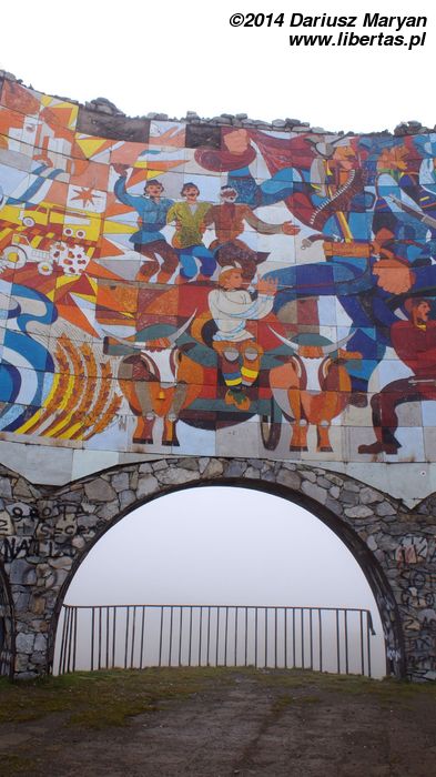 Kolejnym przystankiem był punkt widokowy na okoliczne góry. Niestety tego dnia w tym miejscu chmury zasłoniły wszystko tak skutecznie, że widoczność ograniczała się do kilku metrów. Pozostało nam podziwianie ogromnej mozaiki, przedstawiającej różne wydarzenia z historii Gruzji.