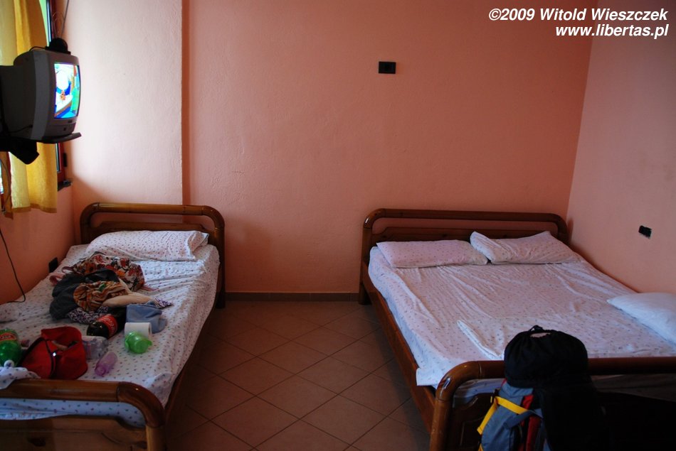 We stopped literally in the first hotel we saw – Kaonia Hotel. It is possible that searching further we would find a cheaper one, but our laziness and holiday “don’t-give-a-monkey-ism” turned out to be stronger than the wish to save a few medications. As many other Albanian hotels, painted green Kaonia looks as if it was not finished, the highest storey is still waiting for its walls and it is by no means sure it is to be the last one. The owners, however, are very kind, the rooms are clean and pleasant and there is a beautiful view of the bay from the balcony. Besides, the hotel is so close to the sea that one can easily throw a pair of wet swimming trunks far enough to reach the beach.