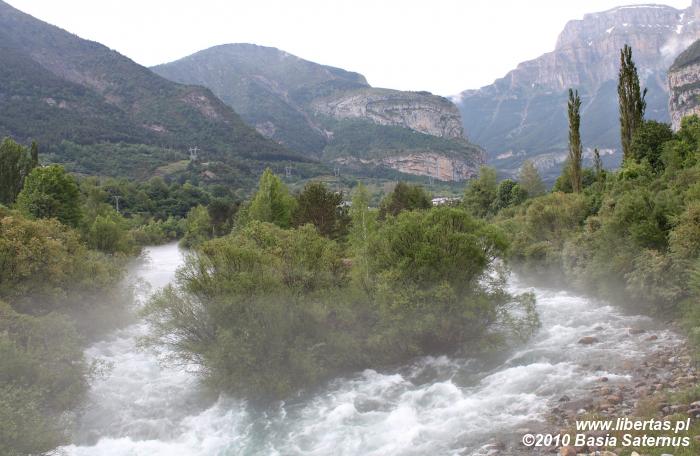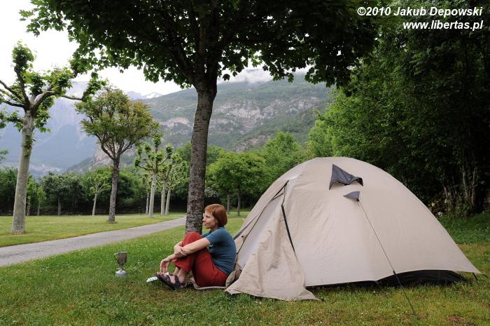 Urzeczeni urokiem miasteczka oraz zachwyceni majestatem otaczających go gór, postanowiliśmy na początek spędzić w Torla kilka dni i stąd rozpoczynać górskie wycieczki. Chcieliśmy dokładnie poznać Dolinę Ordesy i, jeśli tylko pozwoliłaby pogoda, ukoronować pobyt tutaj zdobyciem Monte Perdido. Na bazę noclegową wybraliśmy kamping Río Ara, który położony jest około kilometra od centrum, nad rzeką Ara. Skusił nas wysokim standardem, prawie pustym polem namiotowym oraz zapierającym dech w piersiach widokiem na pionowe ściany strzegące wejścia do doliny. Opłata za namiot i dwie dorosłe osoby to wydatek rzędu 12,5 € za dobę.