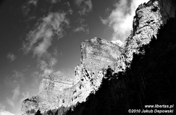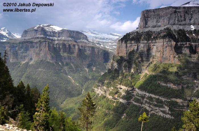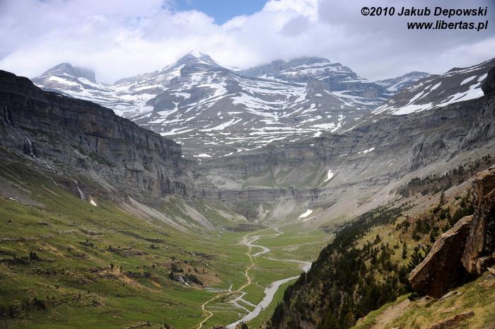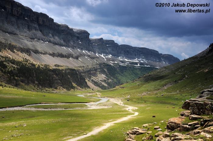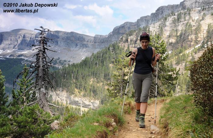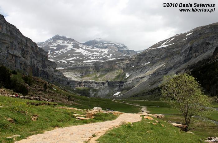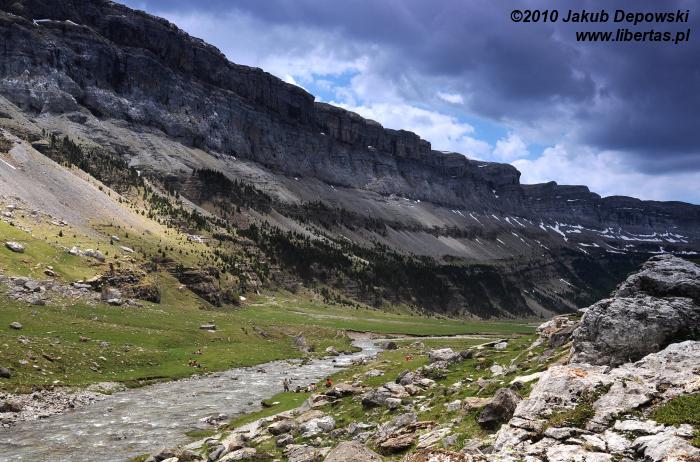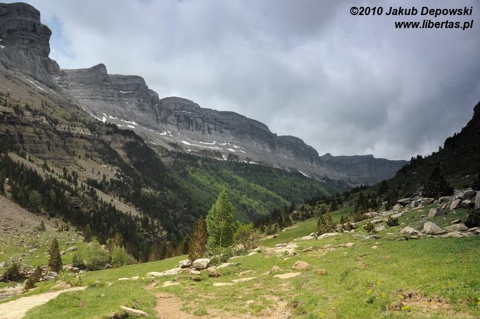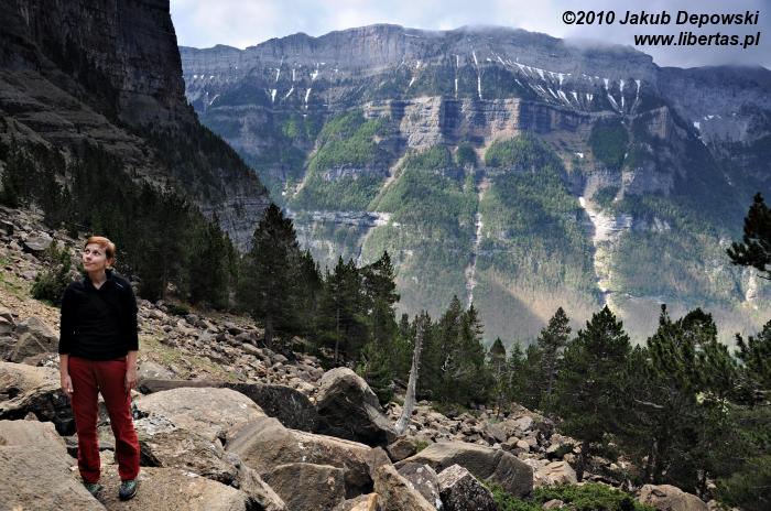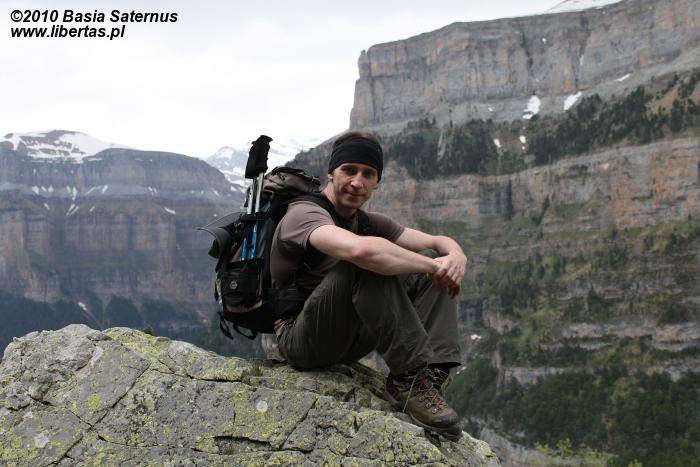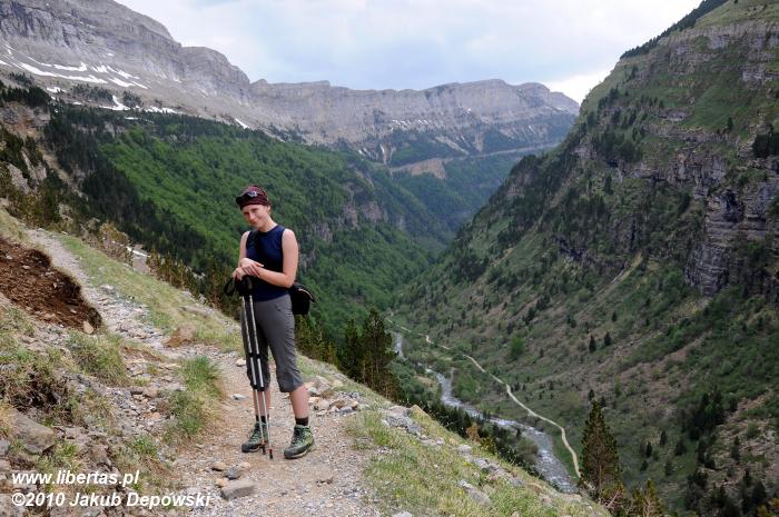 Po pierwszej upojnej nocy na błogo cichym kampingu w Torla przyszedł czas na górski rekonesans. Do Pradera de Ordesa dostaliśmy się stopem. Idąc piechotą moglibyśmy wprawdzie podziwiać piękne widoki, jednak na ten sześciokilometrowy odcinek trzeba by zarezerwować jakieś dodatkowe 1,5 godziny. Ze złapaniem „okazji” nie było problemu, bo jak w każdy letni weekend do doliny ciągnęły tłumy, głównie hiszpańskich turystów. Kiedy przybyliśmy na parking, doznaliśmy lekkiego szoku. Poczuliśmy się jak na Palenicy Białczańskiej. Z dziesiątek samochodów wylewał się tłum. Bez zbędnej zwłoki ruszyliśmy więc w stronę Circo de Soaso (1880 m n.p.m.) – cyrku polodowcowego będącego zwieńczeniem Doliny Ordesy. Trzeba przyznać, że poprowadzony wzdłuż rzeki, z początku mocno zalesiony szlak jest wyjątkowo piękny. Niestety moją uwagę od gór odwracał hałaśliwy pochód turystów, których przez dłuższy czas bezowocnie staraliśmy się zgubić. Całe szczęście, gdy w końcu droga wyłoniła się z lasu, a naszym oczom ukazały się strome, mierzące ponad dwa tysiące metrów ściany, cała reszta poszła w zapomnienie. Nie śpiesząc się zbytnio, po około dwóch godzinach od wyruszenia z parkingu, dotarliśmy do Circo de Soaso, nad którym królują szczyty Monte Perdido oraz Pico de Añisclo (3259 m n.p.m.).