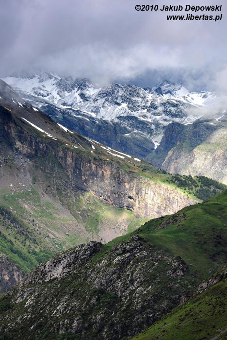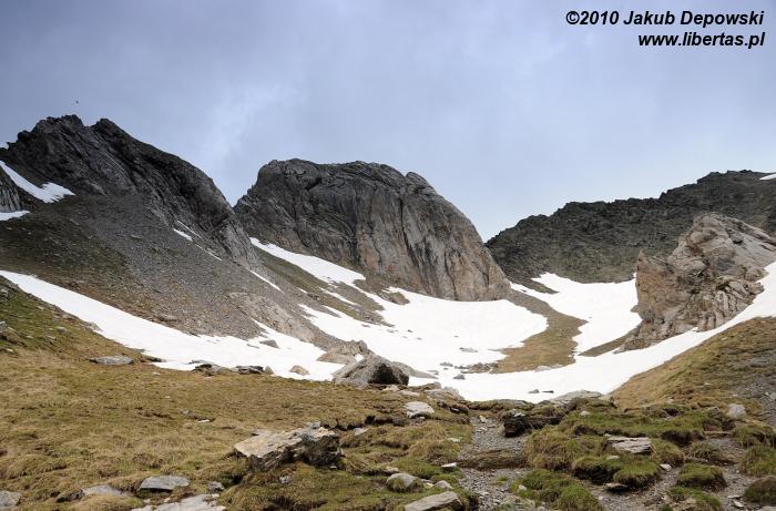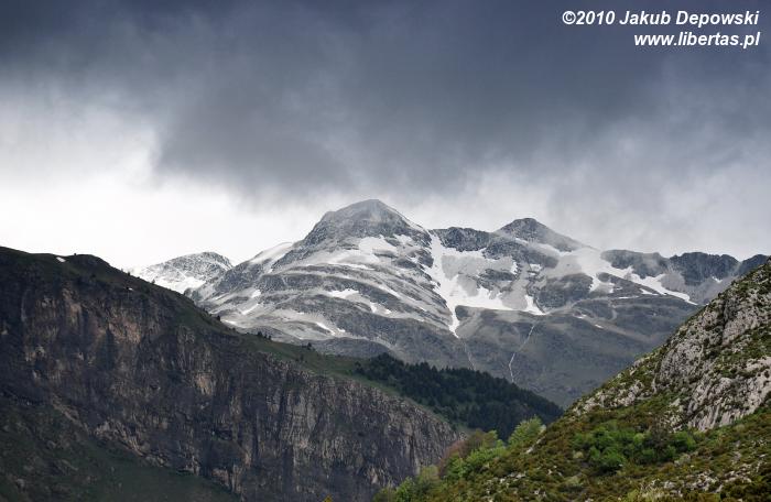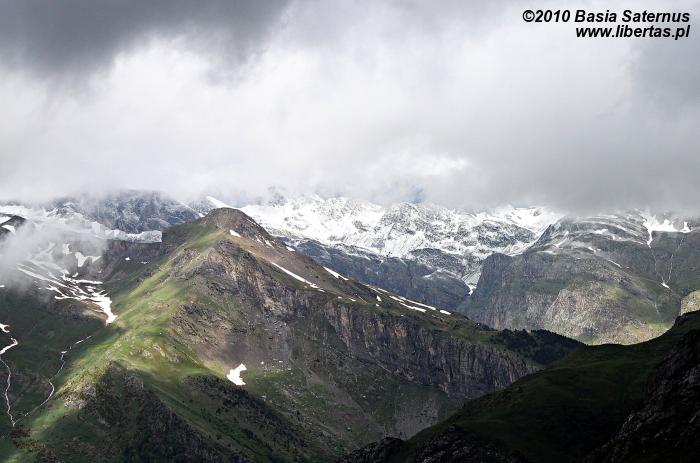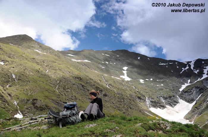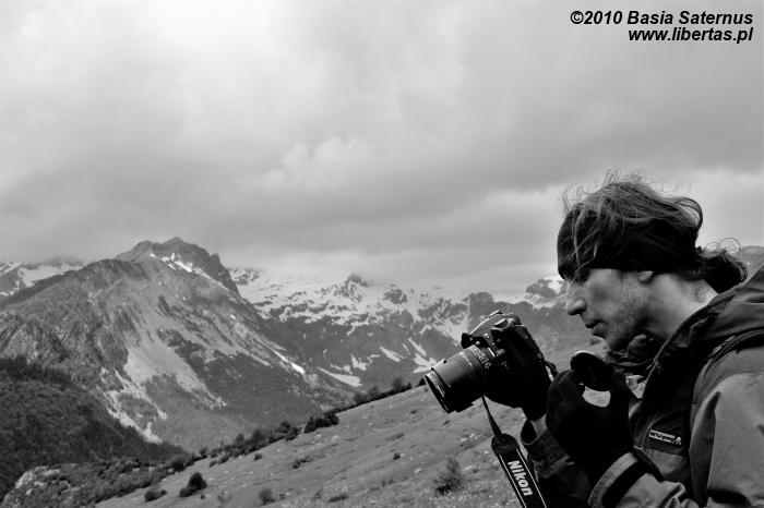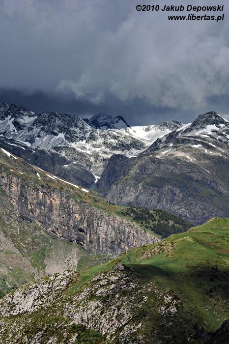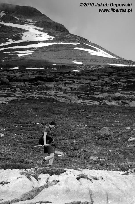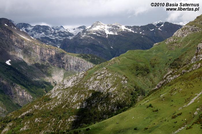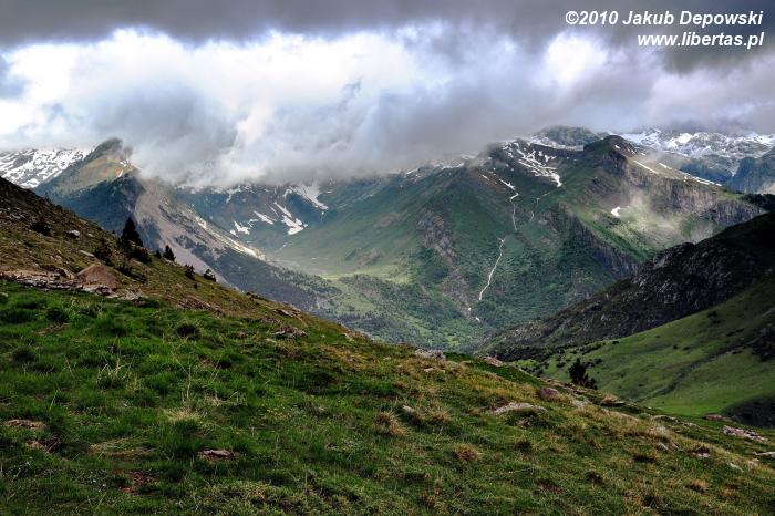 Zgodnie ze wskazaniem mapy rozpoczęliśmy dość długą wędrówkę nieoznakowaną ścieżką w kierunku północnym. Szlak okazał się bardziej wymagający niż się pierwotnie wydawało. Przez kilka godzin pokonywaliśmy kolejne, pokryte zielonym dywanami, wzgórza, na których dosłownie roiło się od nieprzejętych zupełnie naszą obecnością świstaków. Musieliśmy także przeprawić się przez kilka rwących potoków. Im wyżej wchodziliśmy, tym bardziej pogoda przypominała tatrzańską jesień albo wczesną zimę. Przez moment z nieba sypnęło nawet gradem. Mimo wszelkich przeciwności w końcu jednak dopięliśmy swego. Niestety ze względu na szybko zbliżającą się burzę nie mogliśmy zostać na Puerta Bernatuara zbyt długo. Szkoda, bo to zupełnie bezludne miejsce ma naprawdę sporo uroku. W pobliżu znajduje się między innymi staw - Ibón de Bernatuara oraz dwa łatwo dostępne przy dobrej pogodzie szczyty – Carpera (2463 m n.p.m.) i Pico de Bernatuara (2515 m n.p.m.).
