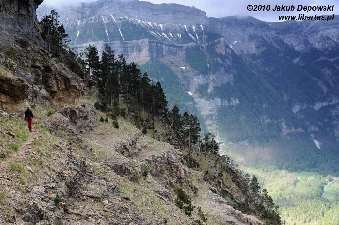 W Circo de Soaso, oczarowani jego urokiem, spędziliśmy kilka godzin, rezygnując tego dnia już zupełnie z dalszych wędrówek. Do pokonania pozostał nam tylko dystans do Pradera de Ordesa. Na parking wrócić można na kilka sposobów. Dno doliny już poznaliśmy, postanowiliśmy zatem skorzystać z jednego z wyżej położonych szlaków. Drogę powrotną wyznaczyła nam Faja de Pelay – ścieżka prowadzącą skalną półką ponad doliną. W Parku Ordesa takich ścieżek, o różnym stopniu trudności, znajduje się kilka. Ze zlokalizowaniem początku obranej trasy nie mieliśmy problemu. Ścieżka jest dobrze widoczna z Circo de Soaso. Gdy pokonaliśmy jakieś kilkadziesiąt metrów, naszym zdumionym oczom ukazała się tablica zakazująca wstępu ze względu na śnieżne lawiny. W ojczystych górach nie mamy zwyczaju łamać zakazów, jednak tym razem górę wzięła żądza przygody oraz obawa, że w najbliższym czasie możemy nie mieć okazji tu wrócić. Resztkę naszych wątpliwości rozwiał widok kilku zmierzających w interesującym nas kierunku turystów.