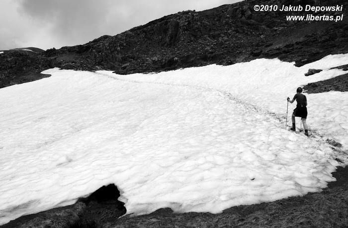 Trzeciego dnia w mokrym Bujaruelo postanowiliśmy, że czas najwyższy coś zrobić. Opcje były dwie – wyjście bez względu na pogodę w góry i zejście na jeszcze jedną noc do tutejszego schroniska, ewentualnie marsz powrotny do Torla. Zdecydowaliśmy się na rozwiązanie pierwsze, a los się do nas trochę uśmiechnął. Poranek nie przywitał nas wprawdzie bezchmurnym niebem, ale przynajmniej przestało lać. Ruszyliśmy na długi, dość trudny szlak prowadzący do schroniska Refugio de Sarradets (2587 m n.p.m.) i dalej w stronę Bramy Rolanda. Chcieliśmy pokonać chociaż część tej trasy. W Bujaruelo widzieliśmy zdjęcia ze szlaku na Bramę sprzed kilku dni, które powinny studzić nasz zapał. Droga była zasypana śniegiem po pas. Mimo to puściliśmy się przed siebie z nadzieją, że dotrzemy przynajmniej do Sarradets.