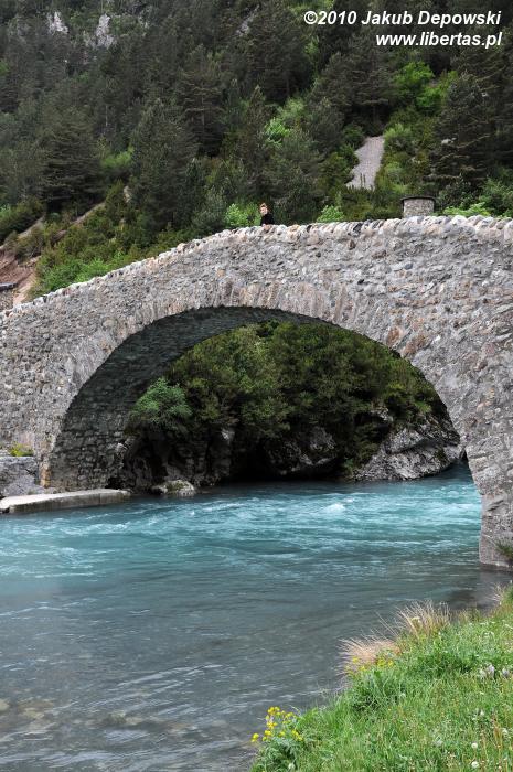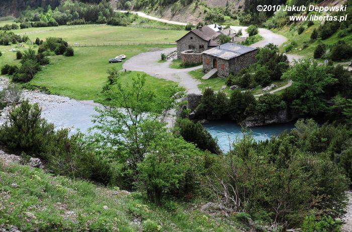 Dolina Bujaruelo, nawet w szarej, deszczowej scenerii, jest miejscem niezwykłym. Kiedyś znajdowała się tutaj wioska, obecnie nie ma stałych mieszkańców. Po średniowiecznej osadzie pozostały jedynie mury trzynastowiecznego kościoła San Nicolás de Bujaruelo oraz kamienny most wznoszący się ponad turkusowym nurtem Río Ara. W dolinie usytuowane jest również ładne, nawiązujące stylem do historycznej zabudowy, schronisko oraz duże pole namiotowe. Liczyliśmy na tani nocleg pod namiotem, jednak przed sezonem kemping okazał się być zamknięty. Z ciężkim sercem i kieszenią uboższą o 18 € od osoby zainstalowaliśmy się w schronisku. Miejsce to bardziej niż górską bazę przypomina wygodny hostel.