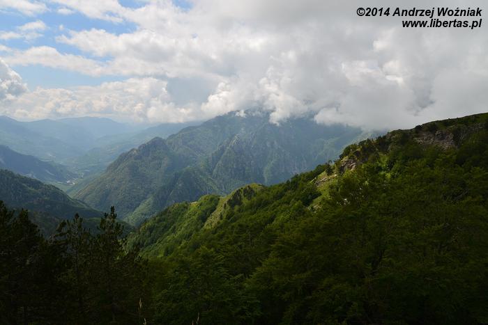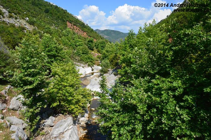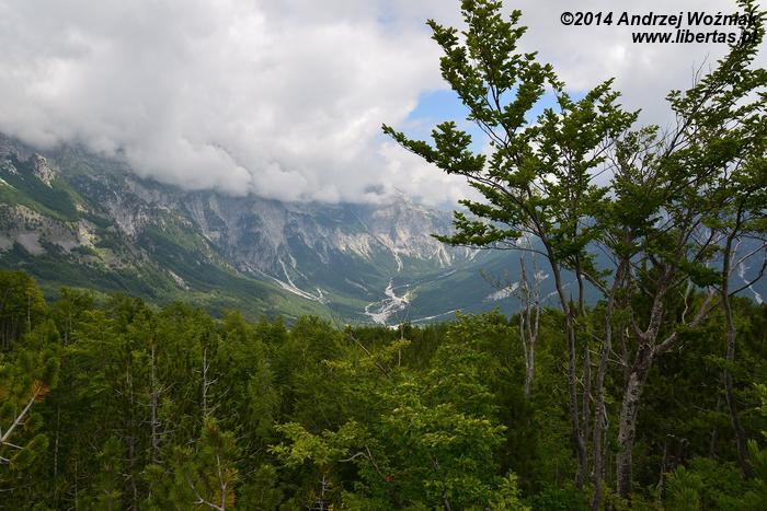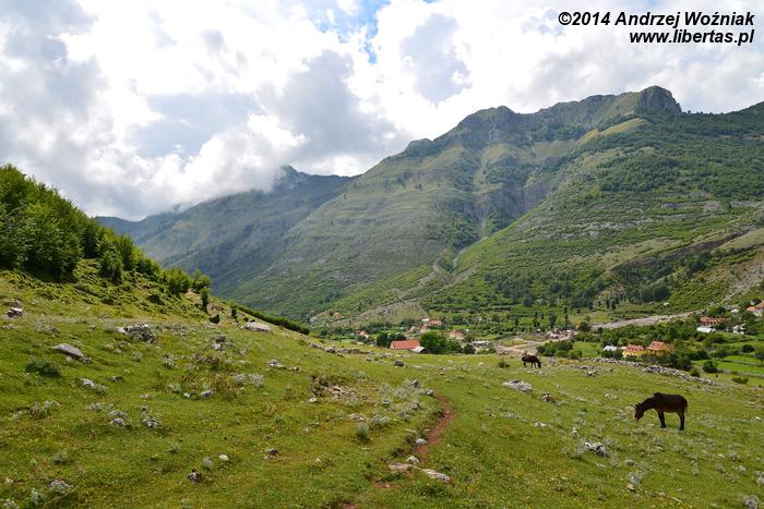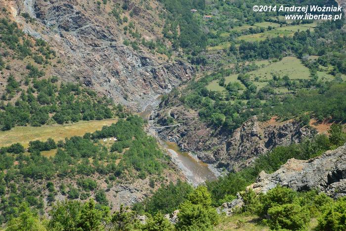 Za którymś zakrętem pokazuje się dolina Theth i rzeka Shala. Widok jest niesamowity, rzeka jest prawie wyschnięta, ale całe jej koryto i wszystkie miejsca, którymi spływa woda z gór, są zupełnie białe, tak więc ma się wrażenie, że w całej dolinie leży śnieg.