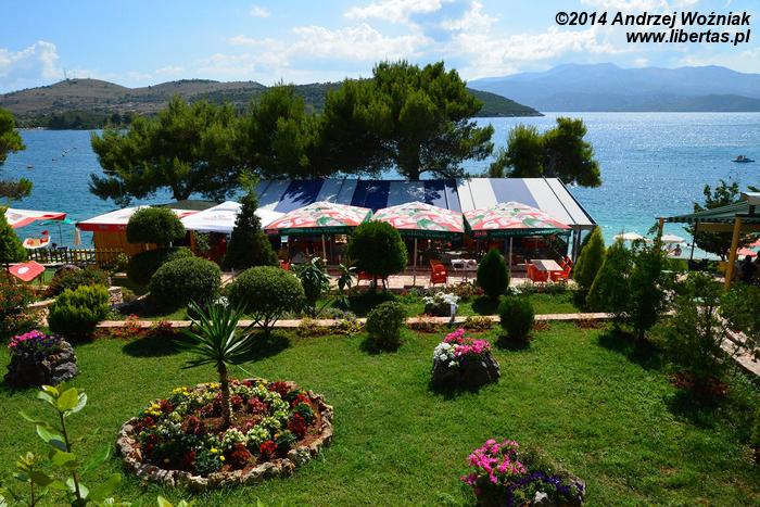 Nasz hotel znajdował się na samym końcu głównej plaży Drymades, z dala od innych i od tłumu. Siedząc na balkonie lub w hotelowej knajpce słuchaliśmy szumu fal. Obie plaże znajdujące się przy hotelu rozdziela skalne ucho igielne, wyjątkowo malownicze miejsce, często pojawiające się w teledyskach albańskich gwiazd. Podczas naszego pobytu dwie kolejne ekipy wybrały to miejsce na tło do swoich występów przed kamerą.
