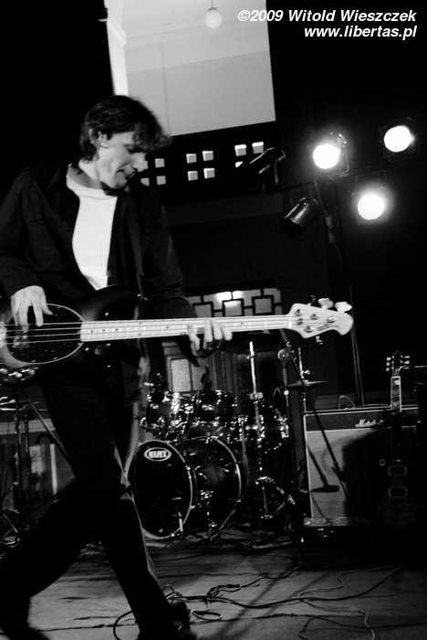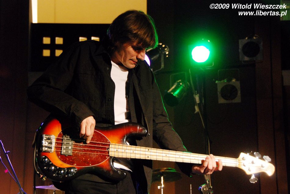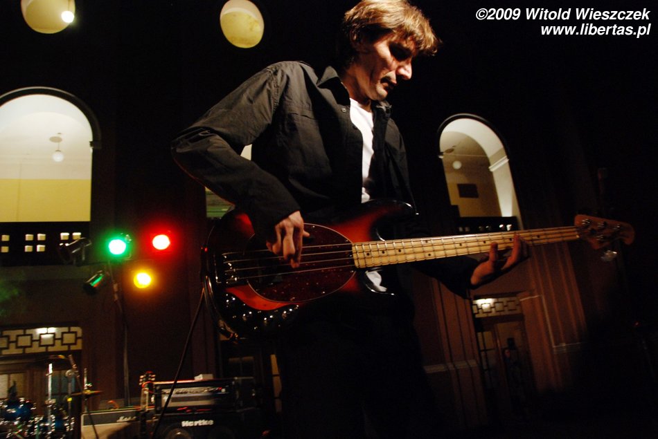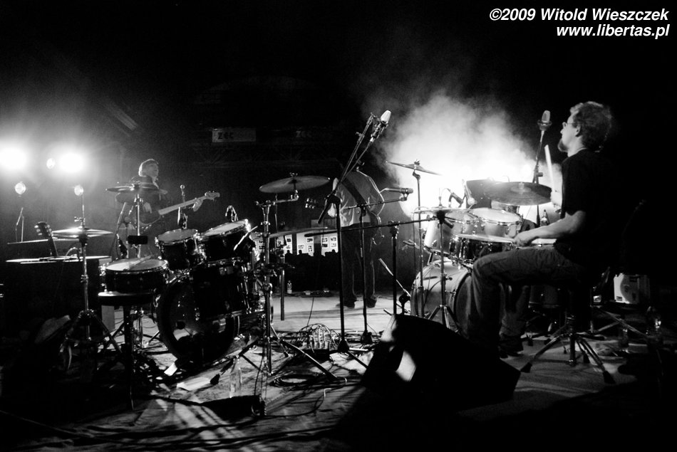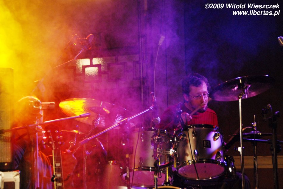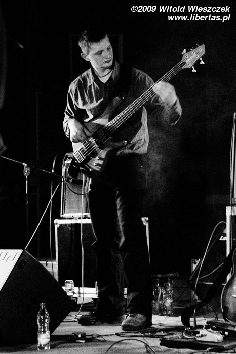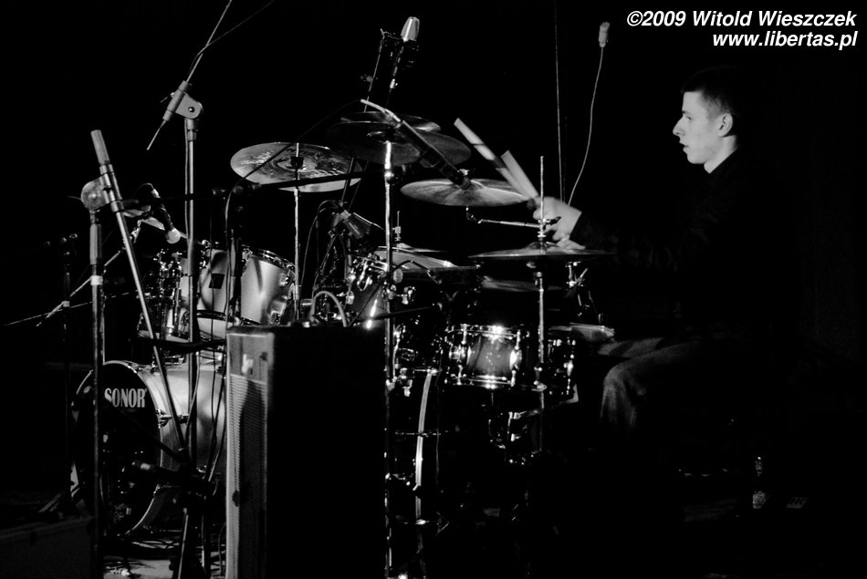 Jak już pisałem, Siódma w nocy to od niedawna trio, nic dziwnego więc, że Kajetan grał za dwóch, ale nie on jeden, pozostali muzycy nie zostawali w tyle! Za dwóch grali również Marek Idzik i Aleksadner Juraszczyk. W przypadku ostatniego pozwoliłem sobie nawet na małą manipulacje i sfotografowałem go z takiej perspektywy, że wygląda, jakby grał na dwóch perkusjach jednocześnie. Każdy, kto słyszał jego solo, na pewno uzna ten zabieg za uzasadniony! Bez cienia przesady mogę powiedzieć, że była to jedna z najlepszych solówek, jakie w życiu słyszałem, podobnie wypowiadał się zresztą kolega Kuba, więc nie jestem w tej ocenie odosobniony.