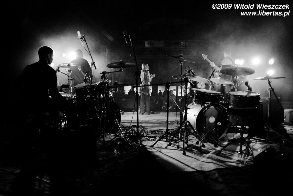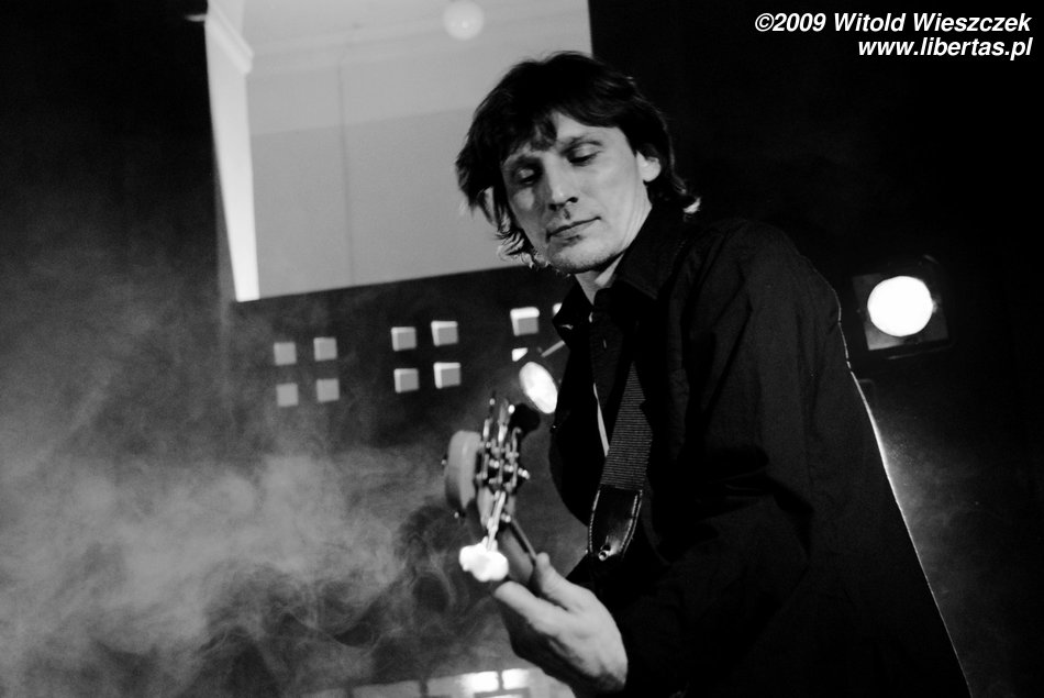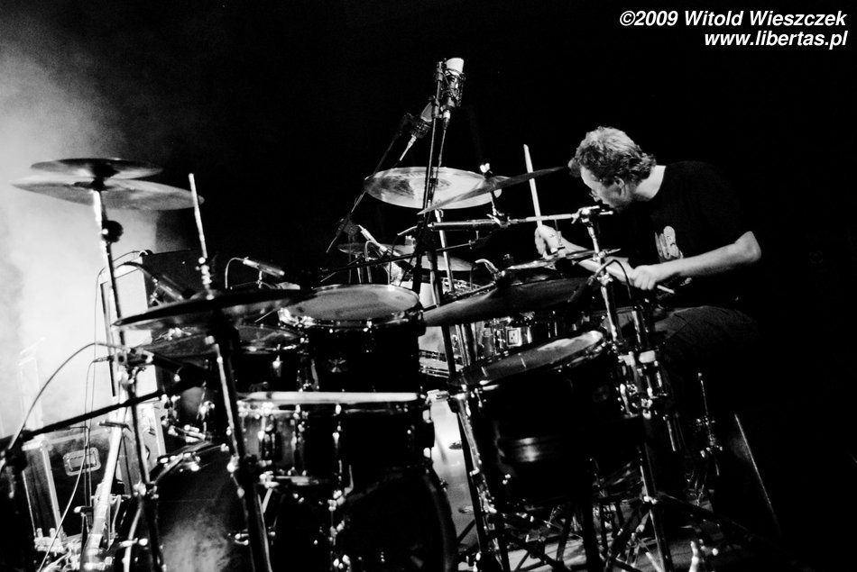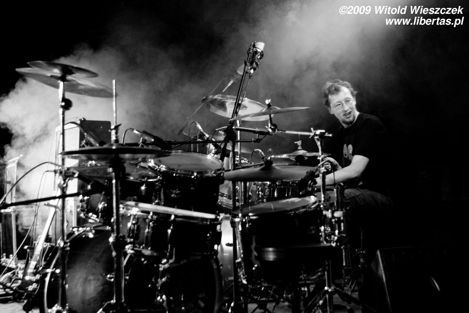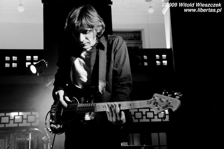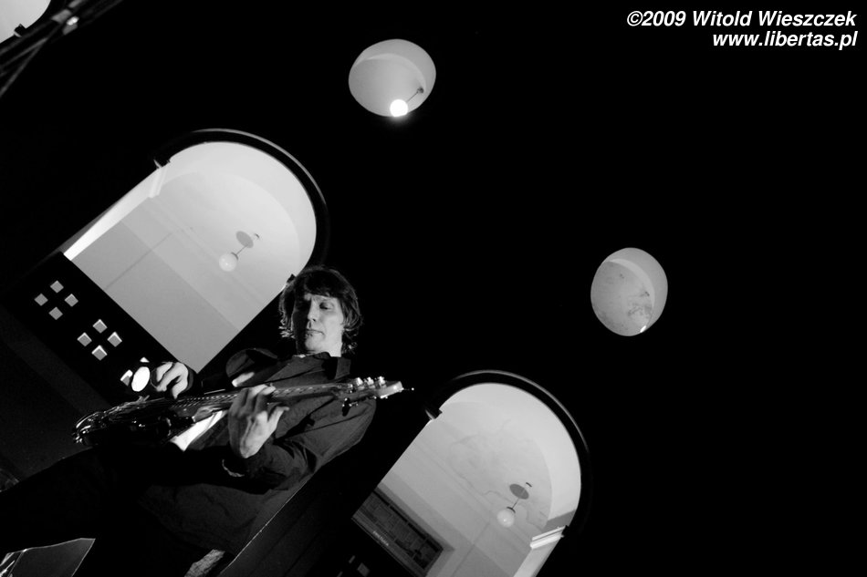 Jak już pisałem, Siódma w nocy to od niedawna trio, nic dziwnego więc, że Kajetan grał za dwóch, ale nie on jeden, pozostali muzycy nie zostawali w tyle! Za dwóch grali również Marek Idzik i Aleksadner Juraszczyk. W przypadku ostatniego pozwoliłem sobie nawet na małą manipulacje i sfotografowałem go z takiej perspektywy, że wygląda, jakby grał na dwóch perkusjach jednocześnie. Każdy, kto słyszał jego solo, na pewno uzna ten zabieg za uzasadniony! Bez cienia przesady mogę powiedzieć, że była to jedna z najlepszych solówek, jakie w życiu słyszałem, podobnie wypowiadał się zresztą kolega Kuba, więc nie jestem w tej ocenie odosobniony.