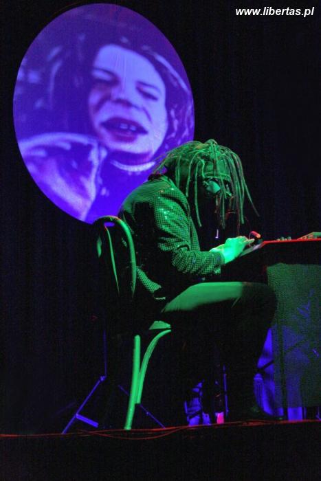 Niewątpliwie elektryzująco oddziaływała scena stylizowana na living room. I tak wystarczyły dwa fotele, lampa w stylu retro, kanapa, kominek z imitacją płomienia by stworzyć niepowtarzalny i intrygujący klimat. I można by pomyśleć, że przed publicznością będzie prezentować się starsza pani i zacznie opowiadać... bajki. Skądże! Wszyscy, którzy mają we krwi nieprzystosowanie i chęć głębokiej analizy rzeczywistości, spodziewali się, że to tylko przykrywka dla czegoś, co nastąpi wraz z wejściem muzyków na scenę. Czegoś totalnego. I pomimo muzyki w tle (ponoć była to kompilacja wybrana przez muzyków) i średniego natężenia rozmów, na sali odczuwalny był ten specyficzny stan wyczekiwania w skupieniu. Być może metaforą tej zmiany był rozstrojony telewizor. W końcu publiczność aplauzem zaczęła dopominać się wejścia muzyków na scenę. I stało się! Najpierw klawiszowiec Chuck, potem gitarzysta Bob, obaj ubrani byli w czerwone upstrzone cekinami fraki, w nieodłącznych maskach jak z filmów science fiction - coś na kształt noktowizora z wystającymi, gumowymi dredami. I jako ostatni wyszedł wokalista Randy - główna postać tego wieczoru. Chuck rozpoczął show jednym zgrabnym ruchem naciskając guzik z psychodelicznym, transowym, niepokojącym podkładem. Reakcje publiczności były często nader spontaniczne i wrzaskliwe. Co też było zrozumiałe, zwłaszcza, że niektórzy czekali na ten koncert kilka lat, a może nawet dłużej...