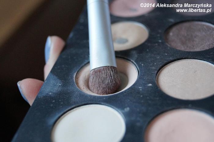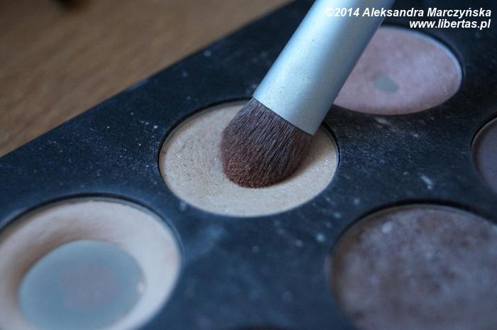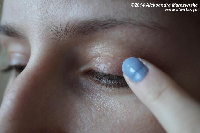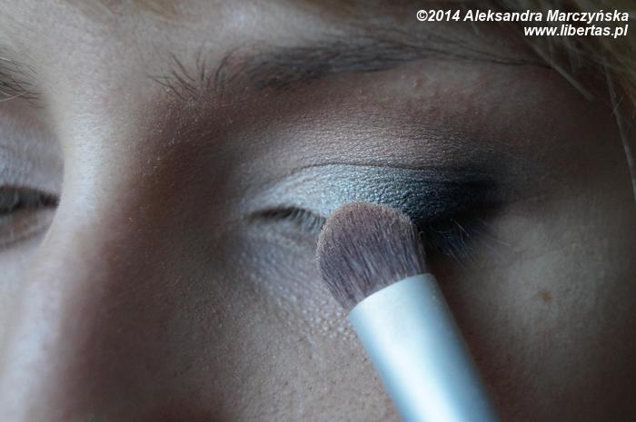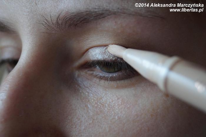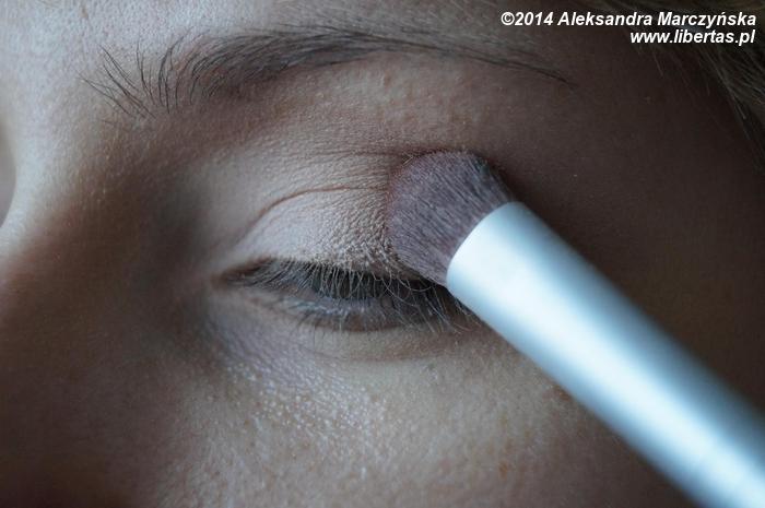 W wewnętrznej stronie powieki nakładamy perłowy cień, po czym delikatnie rozcieramy granice obu cieni, w ten sposób by oba kolory ładnie się połączyły.