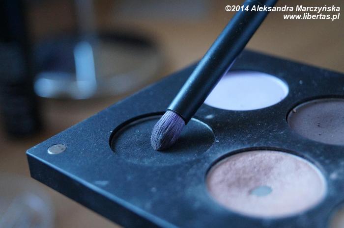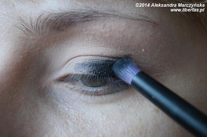 W zewnętrznym kąciku oka, mniejszym pędzlem aplikujemy czarny matowy cień, po czym rozcieramy jego granice.