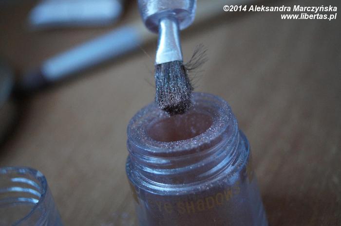 Kolejny krok naszego makijażu to wyczekiwany połyskujący akcent, mianowicie na środek powieki nakładamy sypki złoty cień, który pięknie migocze w sztucznym oświetleniu.