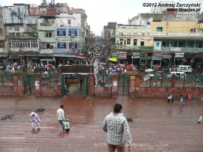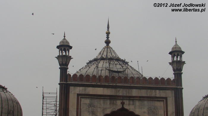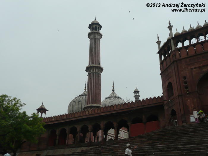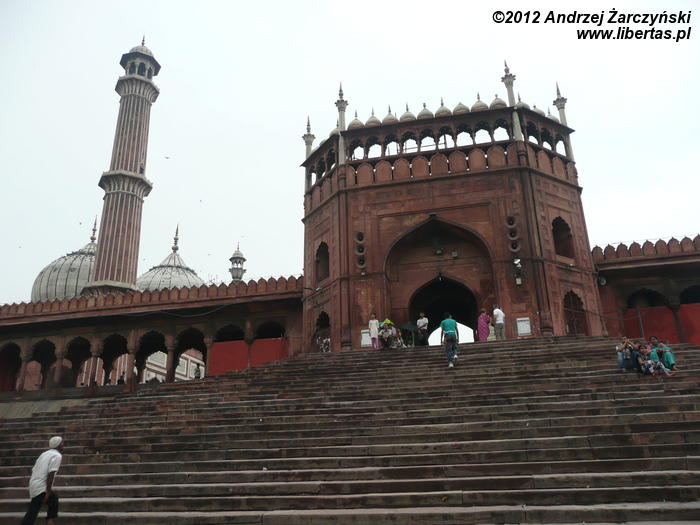 Do Jama Masjid, Wielkiego Meczetu (Meczetu Piątkowego) w Delhi, który zarazem jest największą muzułmańską budowlą sakralną w Indiach, przebijam się przez zatłoczone uliczki Starego Miasta. To dzielnica muzułmańska z konglomeratem wąskich o niskiej zabudowie uliczek zastawionych straganami, mini restauracyjkami i pędzącymi w każdym kierunku rikszami. Oczywiście wśród zgiełku dumnie kroczą przez nikogo niepokojone święte krowy. Przeważają muzułmańskie ubiory. Wśród mężczyzn dominują długie białe galabije z różnymi nakryciami głowy (kufi, kefie, turbany). Kobiety, jak wszędzie chcą być eleganckie, ale trudno to ocenić po jednakowych, czarnych czadorach. Niektóre z nich, prawdopodobnie te bardziej nowoczesne, noszą kolorowe zwiewne suknie i szarawary, a włosy, uszy i szyję skrzętnie zakrywają chustami, hidżabami. Nie spotkałem kobiet w burkach i nikabach. Wśród tłumów są i kobiety w kolorowych sari. Jednym słowem, mieszanka kultur, strojów, ale i na pewno tradycji.