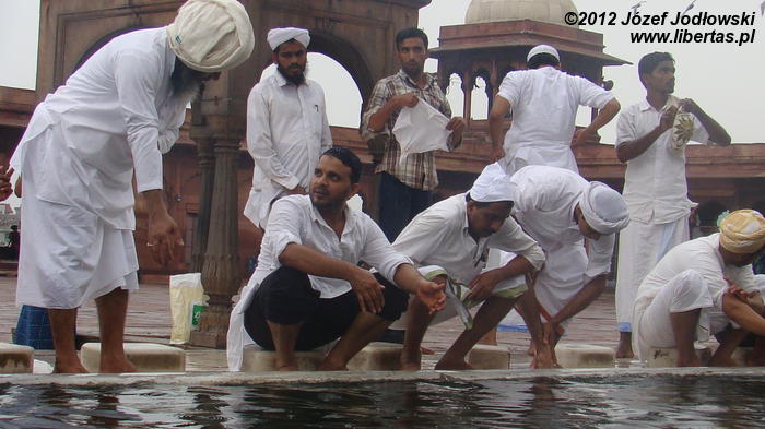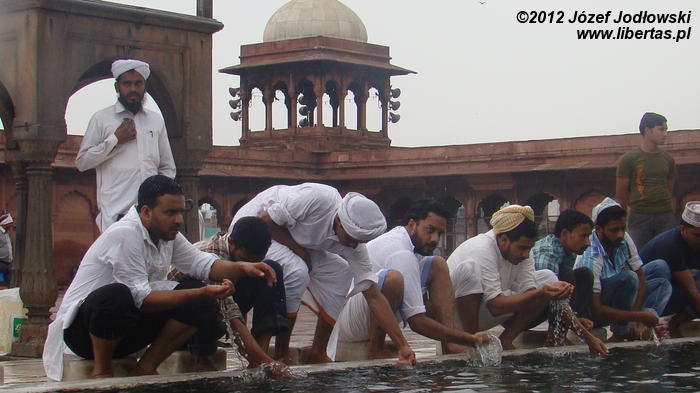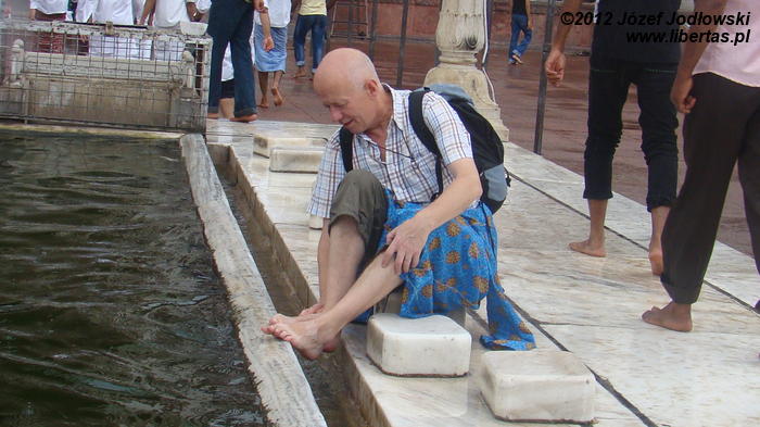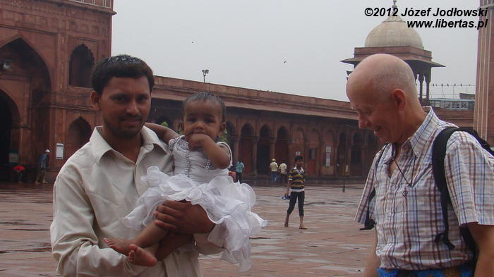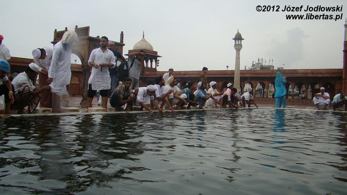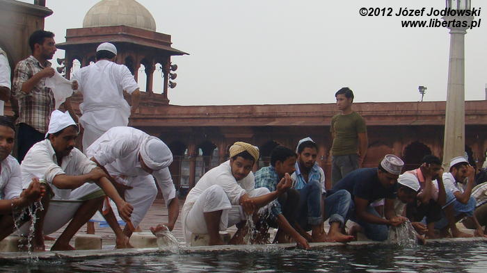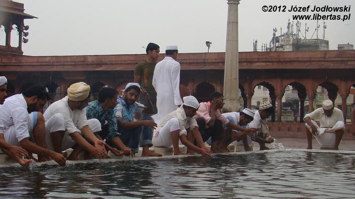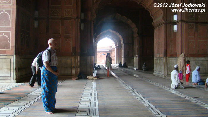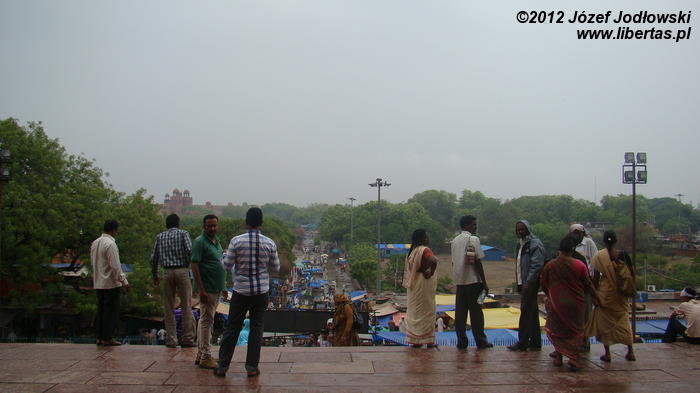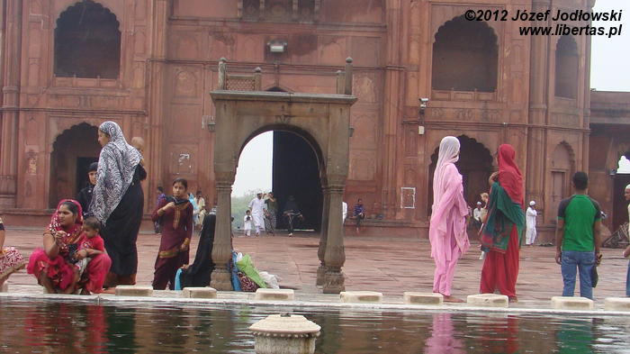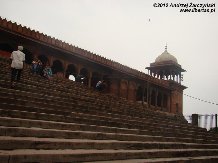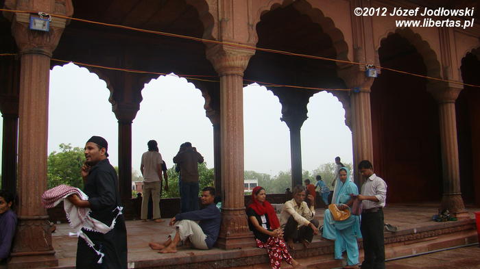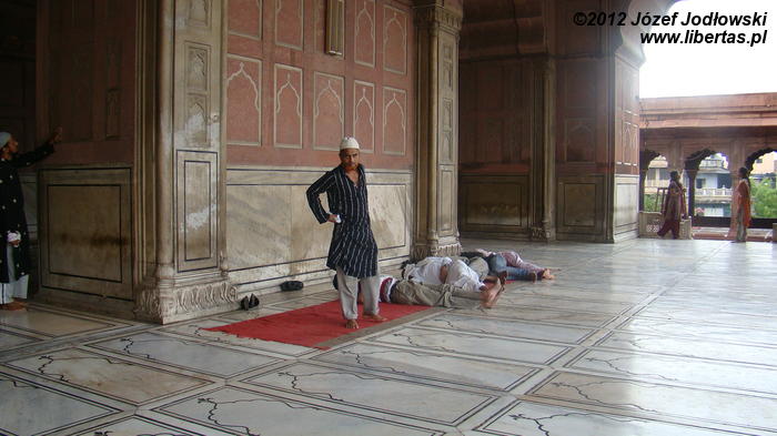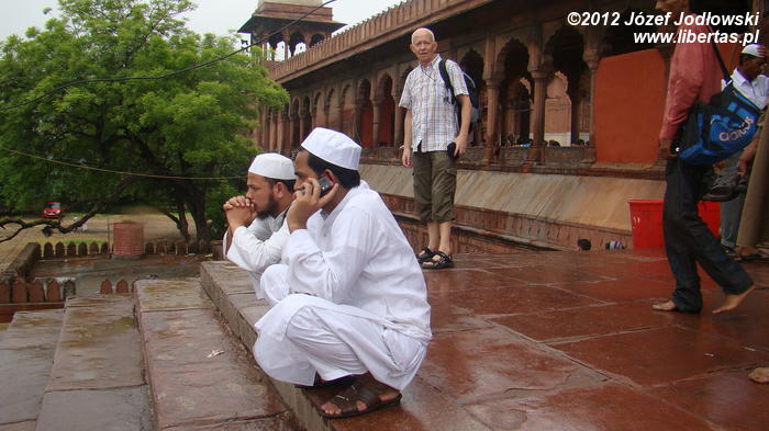 Zaczynam się zastanawiać skąd tyle waśni religijnych, czasami nienawiści. Nie czułem się tu obco. Miałem wrażenie, ze przybywający tu wierni oprócz modlitwy traktują to miejsce jako oazę spokoju, gdzie można wypocząć, porozmawiać z przyjaciółmi lub znajomymi, cieszyć się widokiem otaczającego meczet krajobrazu z Czerwonym Fortem w tle.