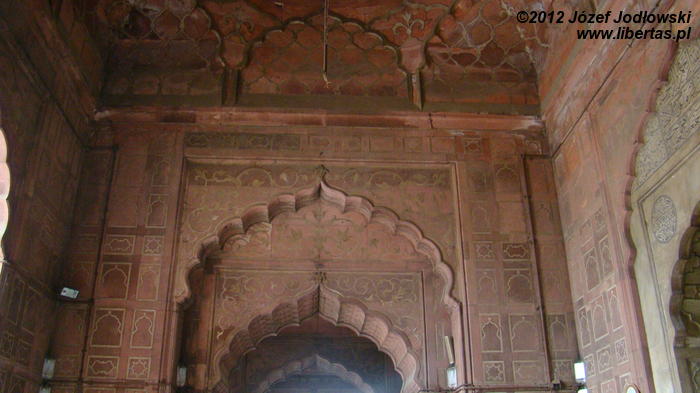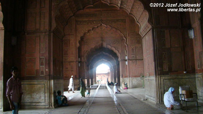 Na dziedziniec wewnętrzny (może pomieścić około 25 tysięcy wiernych) wchodzę bramą południową. Po jego zachodniej stronie okazały meczet, po wschodniej przestrzenne kolumny arkadowe z czerwonego piaskowca zwieńczone murem z blankami. Narożniki muru zdobią cztery wieże z kopułami chatri zakończone pierścieniami z kwiatów lotosu. Pod arkadami spora grupa kobiet w hidżabach i mężczyzn w różnym wieku rozłożyła się bezpośrednio na posadzce. Wypoczywają. Być może po modlitwie towarzyskie spotkanie przed powrotem do domów lub chwila relaksu w parny i gorący dzień.
