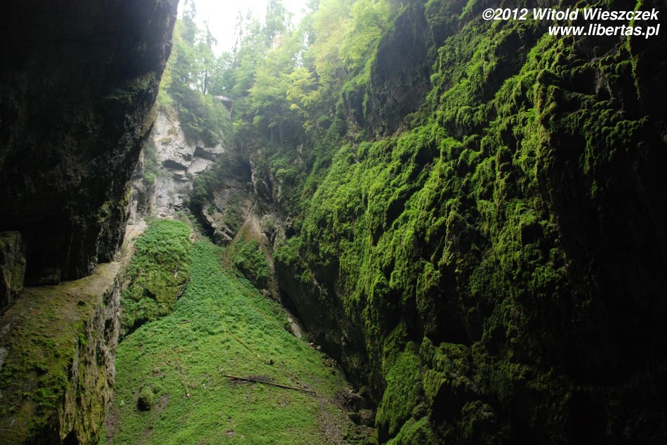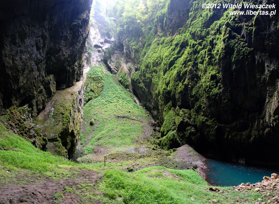 Prawdę mówiąc, to właśnie stąd, a nie z góry, przepaść zrobiła na mnie największe wrażenie. Jej stroma ściana wznosi się ponad 130 metrów nad naszymi głowami i tonie w świetle dnia, zbocza porasta bujna zieleń, a na dnie mieni się turkusem niewielkie jeziorko. Całość wygląda niemal magicznie, obrazek jakby wyciągnięty z książki fantasy.