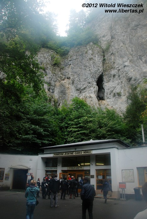 Wijącą się zboczem drogą dojeżdżamy na szczyt wzgórza w pobliżu Przepaści Macocha. Znajdują się tu schronisko, restauracja i sklep z pamiątkami. Stąd odjeżdża również kolejka linowa, którą można dojechać niemal pod wejście jaskini. Jest to jednak dość blisko, więc kto ma zdrowe nogi, ten może tam zejść w ciągu około 20 minut niebieskim szlakiem (około 2 km).