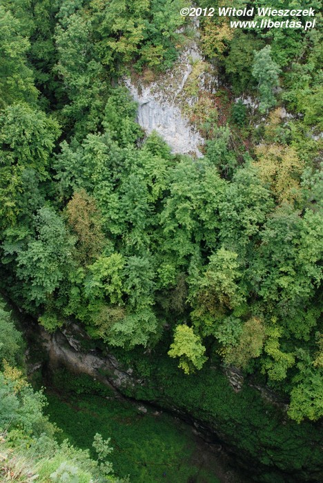 Przepaść Macocha jest najgłębszym (138,5 m) lejem krasowym w Czechach. W 1882 roku na szczycie jego południowej ściany umieszczono platformę obserwacyjną, z której możemy zajrzeć w głąb przepaści. Na dole znajduje się niewielkie, za to głębokie (aż 30 metrów) jeziorko, ale z górnej platformy (horní můstek) nie udało mi się go dojrzeć; widzieliśmy je natomiast bardzo dobrze podczas zwiedzania Jaskini Punkevni, kiedy dotarliśmy w pobliże dna Macochy. Ciekawy jest też widok przepaści z niższej platformy (spodní můstek); myślę, że ciekawszy niż z tej najwyższej. Można do niego dojść w kilka minut, odbijając żółtym szlakiem podczas powrotu na parking.