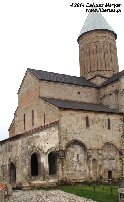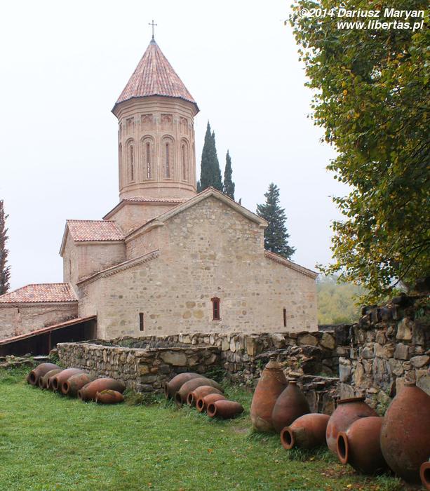 Pierwszy dzień naszej improwizacji rozpoczęliśmy od przejazdu taksówką do Monastyru Alawerdi położonego około dwudziestu kilometrów od Telawi. Po dotarciu na miejsce z powodu wczesnej pory musieliśmy chwilę zaczekać na otwarcie bramy. Poza nami na terenie monastyru nie było zupełnie nikogo. Zbudowany został w XI wieku w okresie zjednoczenia i powstania mocnego feudalnego państwa Gruzińskiego. Na obszarze monastyru spośród klasztornych zabudowań najbardziej okazały jest kościół, który jest ponoć drugim co do wysokości w całej Gruzji. Wnętrze jest nadgryzione zębem czasu, ale i tak warto tam zerknąć. Poza kościołem naszą uwagę zwróciły różne szczepy winogron, które braciszkowie uprawiali w celach winiarskich. Pod murami klasztoru poukładane były wielkie beczki na wino.