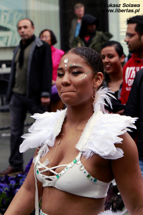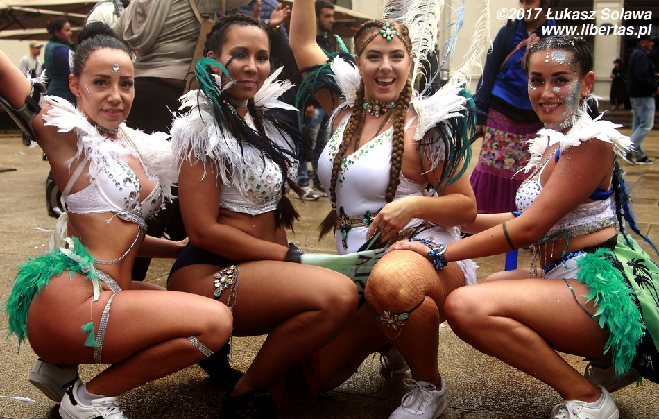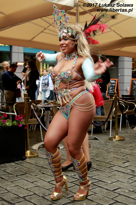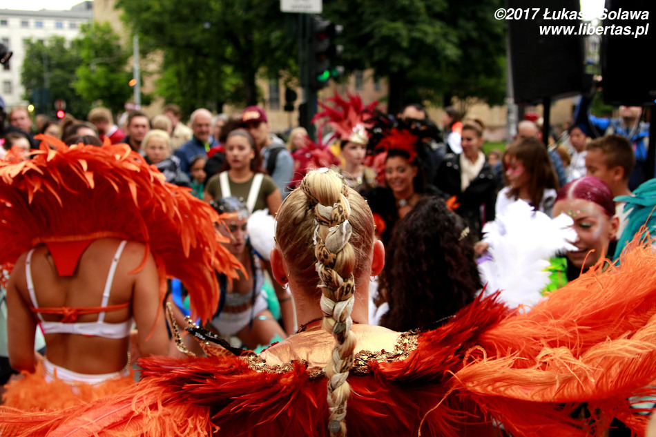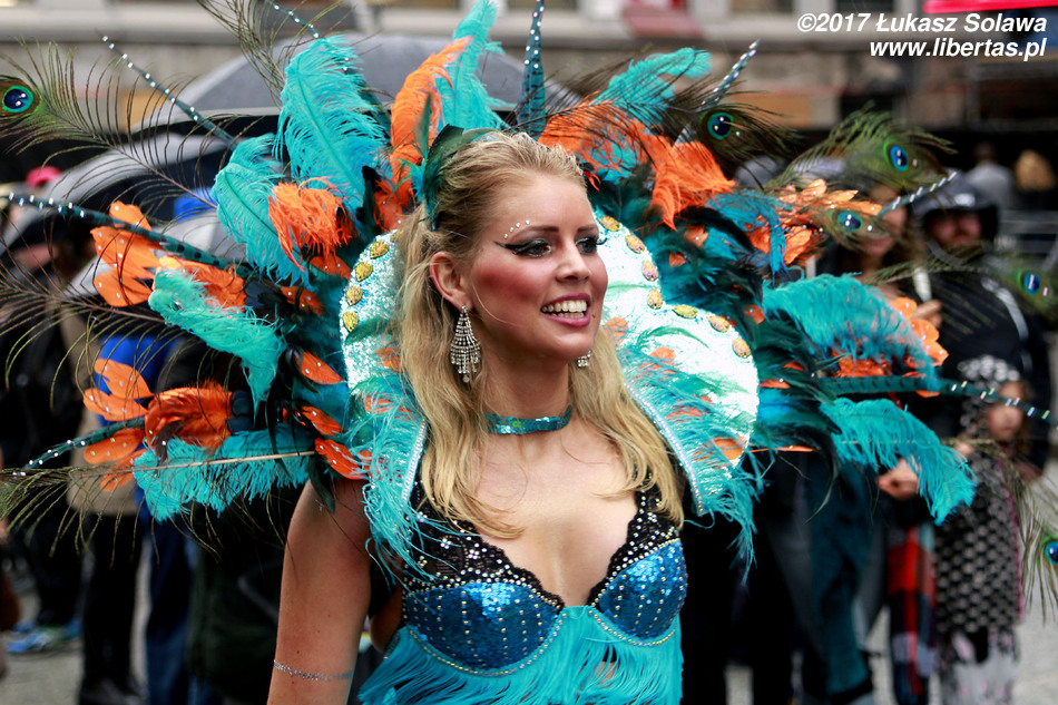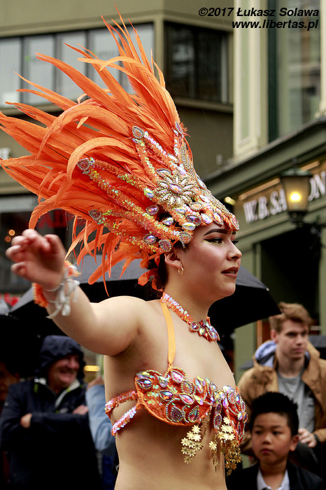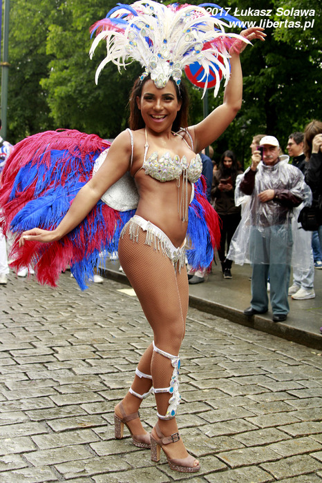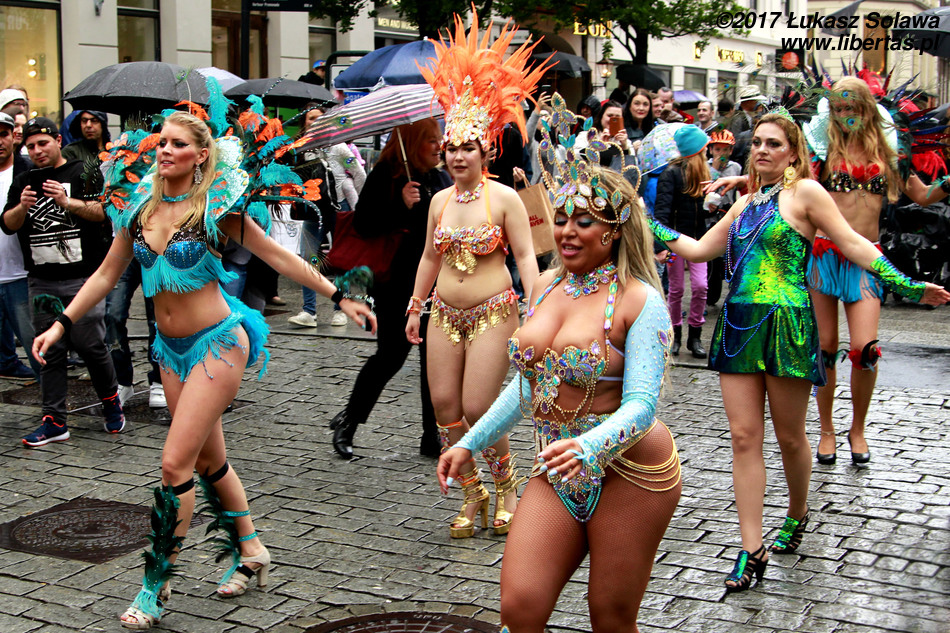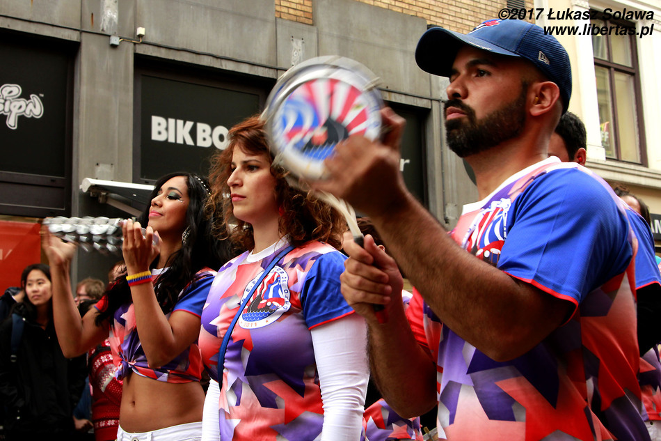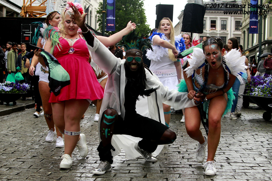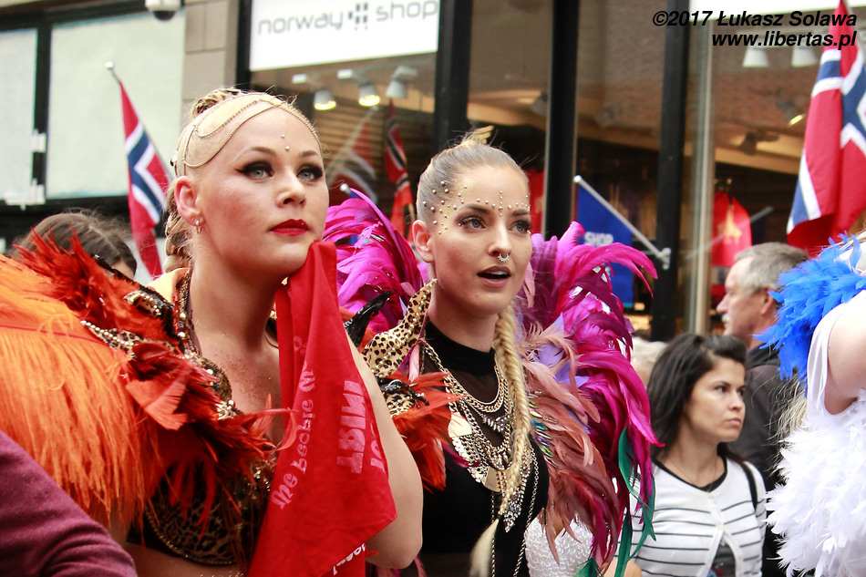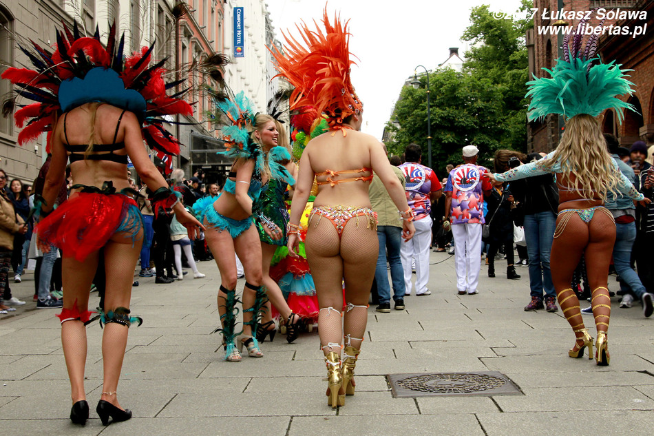 Gdy dotarłem do centrum Oslo, w okolice dworca głównego, pochód już wyruszył. Wystarczyło jednak tylko nadstawić uszu, żeby zorientować się w którą stronę i, że stało się to dopiero co – dźwięk bębnów był bardzo wyraźny. W paradzie brały udział tylko dwie grupy. Pierwszą stanowiły tancerki i muzycy z lokalnej szkoły tańca Oslo Samba Skole. Jednych i drugich było mniej niż poprzednio. Na czele pochodu podążała „matrona” w niebieskiej sukni, dzierżąca chorągiew wspomnianej szkoły. Swoją osobą torowała ona drogę wśród widzów dla uroczej solistki kroczącej tanecznym krokiem przed bębniarzami i śpiewającymi na żywo wokalistami. Dopiero za nimi na wysokich obcasach pląsały pozostałe tanecznice wystrojone w mniej lub bardziej frywolne kreacje przystrojone piórami i cekinami. Orszak powoli, ale systematycznie przemieszczał się w górę ulicy. Muzycy walili w bębny, a dziewczyny tańczyły i chętnie pozowały do zdjęć. Z czasem liczba chętnych do zdjęcia z solistką była tak duża, że orszak musiał się zatrzymać. Mimo to nikt się nie złościł. Wszak chodziło o zabawę.