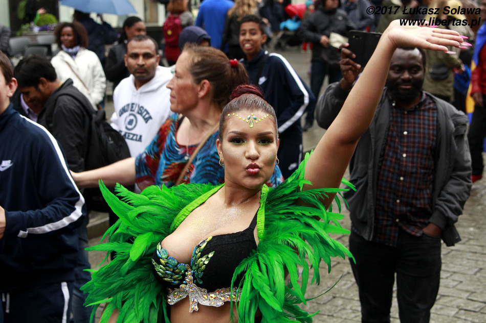 Drugą i zarazem ostatnią grupą biorącą udział w tegorocznym karnawale, byli członkowie stowarzyszenia Caribbean Islands Oslo. Tutaj szalał prawdziwy karaibski żywioł. Każdy tańczył, czy też poruszał się na swój indywidualny sposób. Nie było mowy o żadnej ustalonej z góry choreografii. Centralnym punktem całego zamieszania był wózek z nagłośnieniem, z którego roztaczały się dudniące karaibskie rytmy. Jego siłę napędową stanowili sami artyści. Wokół niego, niczym satelity krążyły tancerki, wystrojone według swych indywidualnych upodobań: w pióra, tiary, cekiny, stroje kąpielowe czy bieliznę, ale też jeansy, sukienki i ich wszelkie kombinacje. Na tańczących nacierał tłum gapiów uzbrojonych w telefony, aparaty i parasole. Te ostatnie okazały się być bardzo przydatne, gdyż łagodna mżawka towarzysząca pochodowi niemalże od początku, z czasem zaczęła się rozkręcać. Rozgrzane tańcem danserki samby z godnością i uśmiechem ignorowały spływające po ich ciałach zimne krople. Natomiast wśród grupy karaibskiej dało się dostrzec krążące plastikowe kubki z jakowymś rozgrzewającym eliksirem nalewanym wprost z butelki.