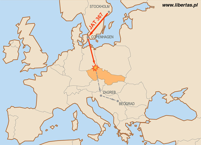 Samolot Douglas DC-9 jugosłowiańskich linii lotniczych Jat Airwais leciał ze Sztokholmu przez Kopenhagę, do jugosłowiańskiego Zagrzebia, a potem do Belgradu. Lot miał nr JAT-367. Do czechosłowackiej przestrzeni powietrznej wleciał na wysokości ponad 10.000 metrów. Było kilka minut po godzinie 17 i nic na pokładzie samolotu nie wskazywało na to, że są to ostatnie chwile przed katastrofą feralnego lotu.
