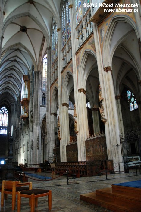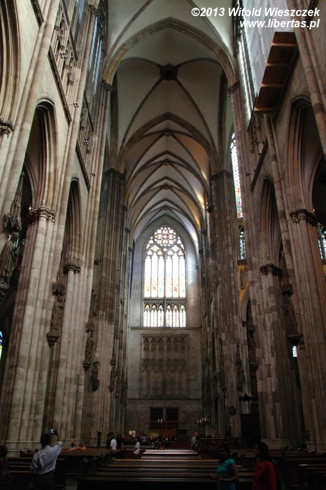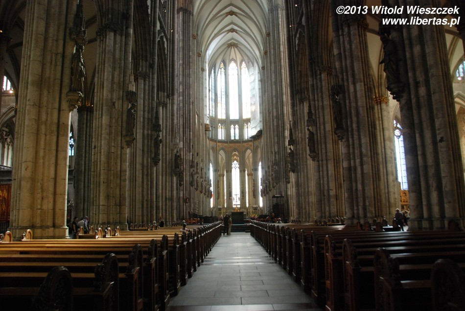 Przestronne, rozświetlone wpadającym przez witraże kolorowym światłem zachwyca ad maiorem Dei gloriam et Beatissime Virginis Mariae honorem. Świątynia ma formę bazyliki, a więc nawa główna jest wyższa od naw bocznych, a jej okna dodatkowo rozświetlają wnętrze. Nawy boczne, po dwie z każdej strony, przechodzą w trójnawowy transept, a dalej w ambit okalający prezbiterium. Ambit odgrodzony jest żelazną bramą i między innymi podczas nabożeństw nie można się do niego dostać. Jednak gdyby przejście było zamknięte, warto się dowiedzieć, kiedy danego dnia będzie możliwość wejścia i przyjść ponownie. Tutaj znajduje się Krucyfiks Gerona, Madonna Mediolańska, a w jednej z kaplic otaczających wieńcem ambit szczątki naszej królowej Rychezy. Okrążając prezbiterium, mamy też możliwość podejść bliżej i obejrzeć wykonany na przełomie XII i XIII wieku piękny, pozłacany Relikwiarz Trzech Króli kryjący ponoć ich doczesne szczątki1.