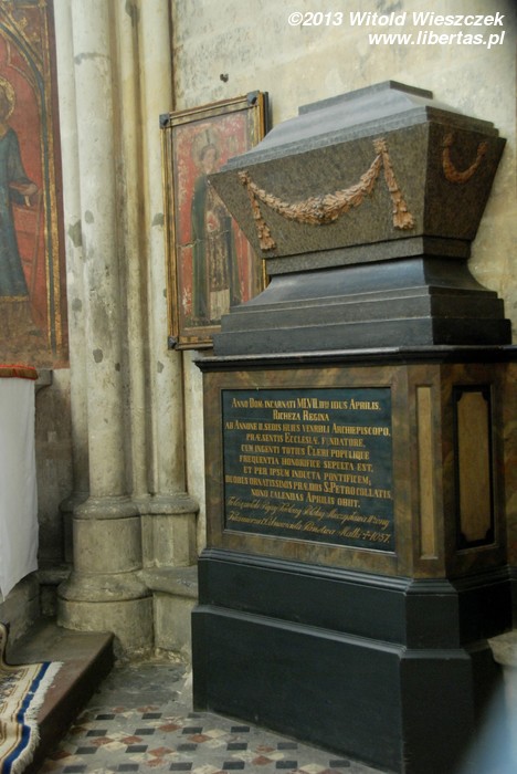 Anno Dom: incarnati MLVII.II idus Aprilis, Richeza Regina Ab Annone II, sedis huius venrbli2 Archiepiscopo, præsentis Ecclesiæ fundatore, cum ingenti totius Cleri populique frequentia honorifice sepulta est, et per ipsum inducta pontificem; duobus ornatissimis prædiis S:Petro collatis, nono calendas Aprilis obiit.