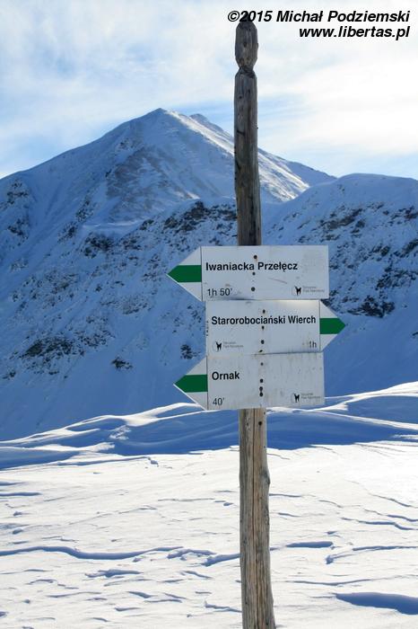 Z Hali Ornak kierujemy się żółtym szlakiem w stronę Przełęczy Iwaniackiej (1459 m n.p.m.). Niedługo za schroniskiem wkraczamy w las, w którym już powoli zaczyna się podejście. Po upływie około godziny i 15 minut dochodzimy na niewielką polanę, z której dostrzec możemy masyw Kominiarskiego Wierchu – to właśnie Przełęcz Iwaniacka, na której porzucamy szlak żółty (zmierza on do Doliny Chochołowskiej). Podążamy teraz za zielonymi oznaczeniami. Znów wchodzimy na otoczoną drzewami ścieżkę. Powoli pniemy się ku górze, a gdy las zaczyna przechodzić w kosodrzewinę, podejście staje się coraz bardziej intensywne. Dzięki temu coraz lepiej też widoczna jest pozostawiona przez nas za plecami Dolina Kościeliska. W końcu docieramy do wypłaszczenia, z którego rozciągają się już bardzo rozległe widoki – znajdujemy się na Suchym Orczańskim Wierchu, z którego doskonale widać Ornak, a także nasz cel – Starorobociański Wierch. Od Ornaku dzieli nas jeszcze krótkie podejście (ma on wysokość 1854 m n.p.m.), a dojście na niego od Przełęczy Iwanianckiej powinno zająć nam około dwóch godzin.