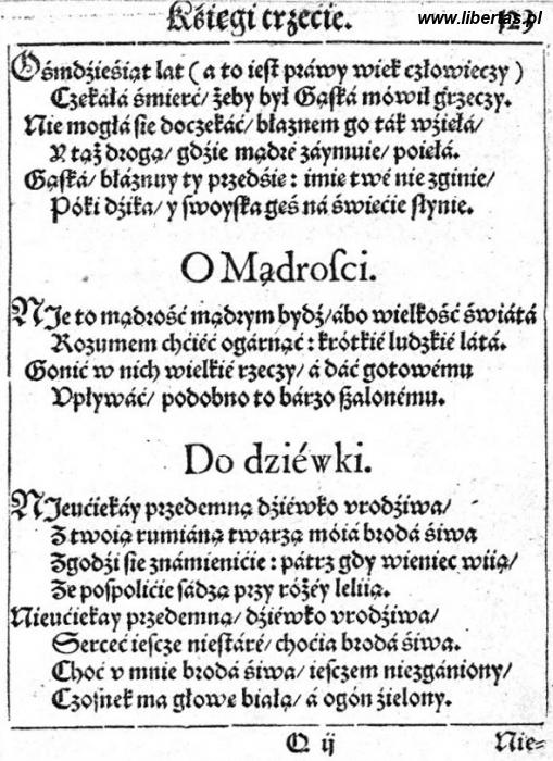Fraszki... niby taka błahostka... a jakże mnie ich lektura pochłonęła. Już tak przywykłem do tego starego druku i starej pisowni, że ostatnie części postanowiłem podać Wam, Drodzy Czytelnicy, w formie możliwie najbardziej zbliżonej...Fraszki Jana Kochanowskiego, księgi trzecie (1-28)