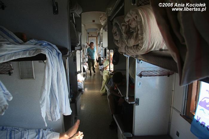 Przedziały nie mają drzwi. To takie na pół oddzielone prycze, gdzie nie ma miejsca na prywatność, ale i też o wszelką podejrzaną działalność trudniej, dlatego choć mało „prywatne”, dają poczucie względnego bezpieczeństwa. W naszym wagonie nie ma cudzoziemców. Do przygranicznych Nauszek jedziemy z tubylcami. Tam dopiero przesiądziemy się w wypełnione turystami wagony mongolskie.