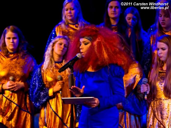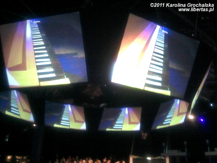 Wielką rolę na scenie odegrał chór dziewczęcy z Islandii, który wielokrotnie powodował u mnie gęsią skórkę i dzięki któremu na scenie poza wymienionymi było niewiele instrumentów. Poza chórem towarzyszyło Björk trzech muzyków: jeden od harf, drugi instrumentów perkusyjnych i trzeci za specjalnie skonstruowanym multimedialnym stołem, dzięki któremu oprócz dźwięków mieliśmy okazję podziwiać na telebimach ciekawe wizualizacje, nawiązujące do świata natury. Dużą niespodzianką było wykonanie psychodelicznego Nattura, który został wydany tylko na specjalnym dobroczynnym singlu w 2008 roku.